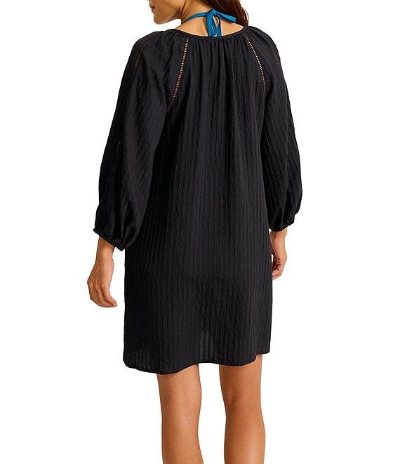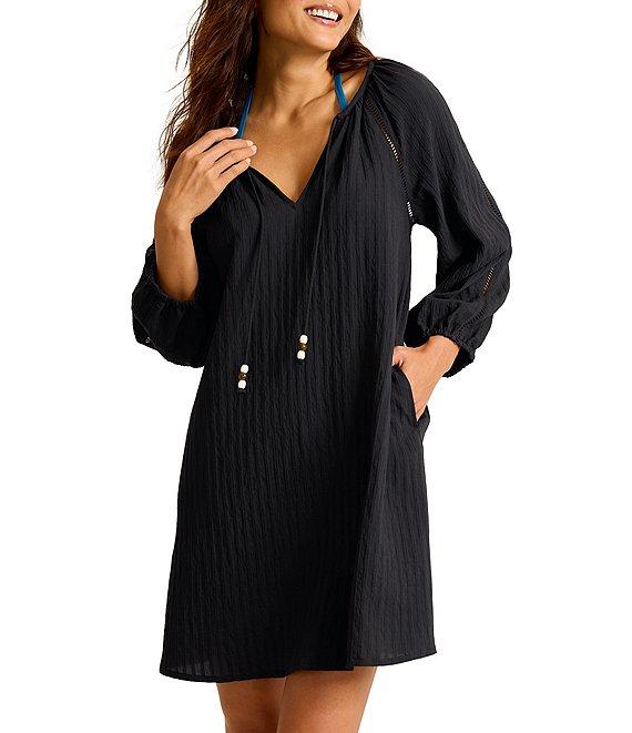 From Tommy Bahama, this swim cover-up features: Woven fabrication Tunic silhouette Split v-neckline 3/4 blouson sleeves with elastic cuffs Side seam pockets Unlined Straight hemline Pullover construction Approx. 40" length Lenzing/ecovero/viscose/recycled nylon Hand wash Imported.