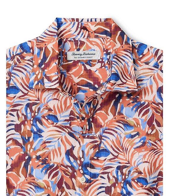 From Tommy Bahama, this shirt features: Allover print Spread collar Short sleeves Button-front closure Left chest slightly rounded pocket Shirttail hem Quick dry Moisture wicking Stretch fabric Polyester/spandex Machine wash/tumble dry Imported.