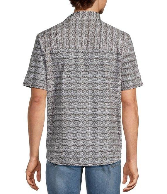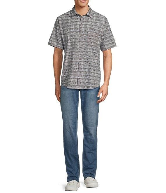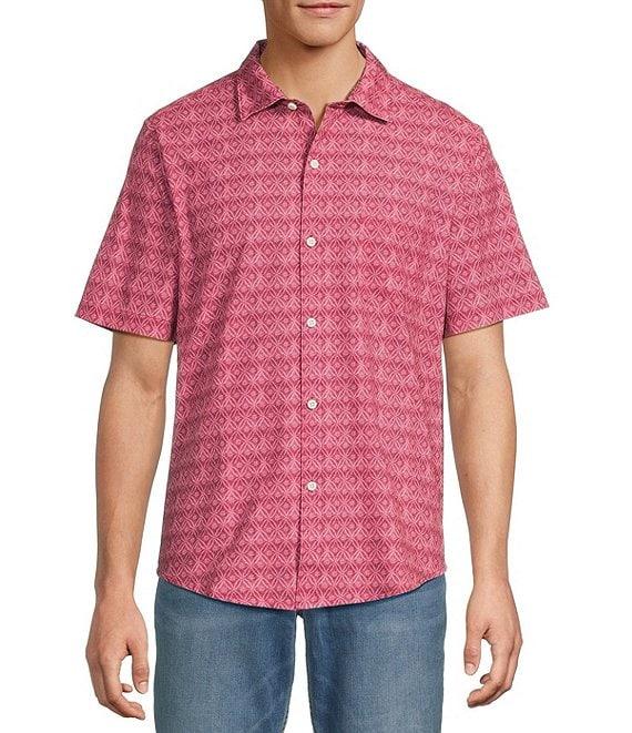 From Tommy Bahama Big & Tall, this shirt features: Allover pattern Spread collar Short sleeves Button-front closure Pocket on the left side of chest Shirttail hem Regular fit Stretch Moisture-wicking Quick-drying Polyester/spandex Machine wash/tumble dry Imported.