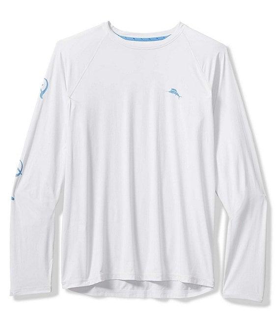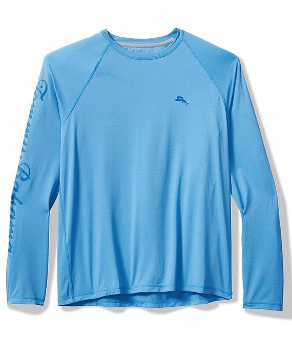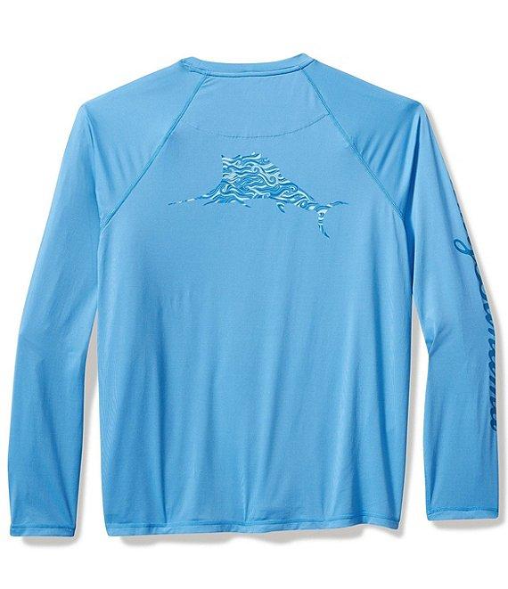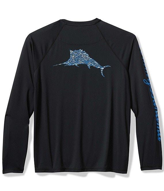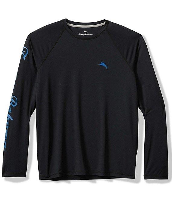 From Tommy Bahama Big & Tall, this T-shirt features: Crew neckline Long sleeves Small marlin on the left side of the chest Large graphic on the back Pullover construction UPF 30 Cooling properties Quick dry and moisture wicking Nylon/spandex Machine wash/tumble dry Imported.