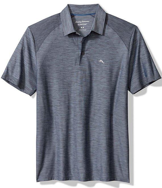 From Tommy Bahama Big & Tall, this polo shirt features: Polo collar Short sleeves 3-button placket Tonal silicone "Marlin" on the left side of the chest Ventilation stitch details at the side seams, sleeves, and shoulders Pullover construction Yarn-dyed IslandZone® performance recycled polyester with engineered stitch transfer design Machine wash/tumble dry Imported.