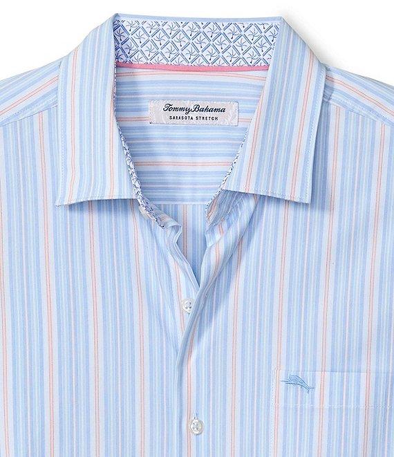 From Tommy Bahama, this t-shirt features: Vertical stripe pattern Hidden button-down collar Long sleeves Button-front full closure Patch pocket on left side of chest Shirttail hem Quick drying Moisture-wicking Stretch fabric Cotton/COOLMAX® EcoMade polyester/Lycra® spandex Machine wash/tumble dry Imported.