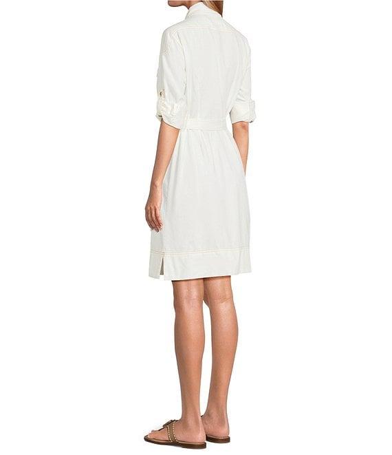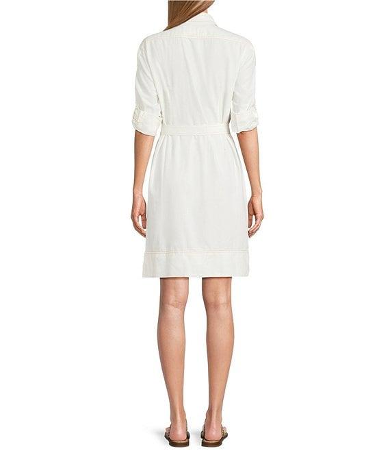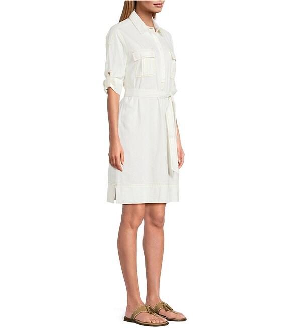 From Tommy Bahama, this dress features: Solid pigment garment dye enzyme wash twill fabrication Shirt dress silhouette Short sleeves Button front closure Roll tabs Side slits Pockets Removable fabric belt Approx. 38" length Cotton Machine wash Imported.