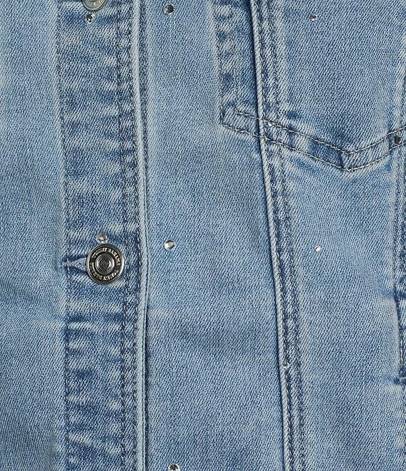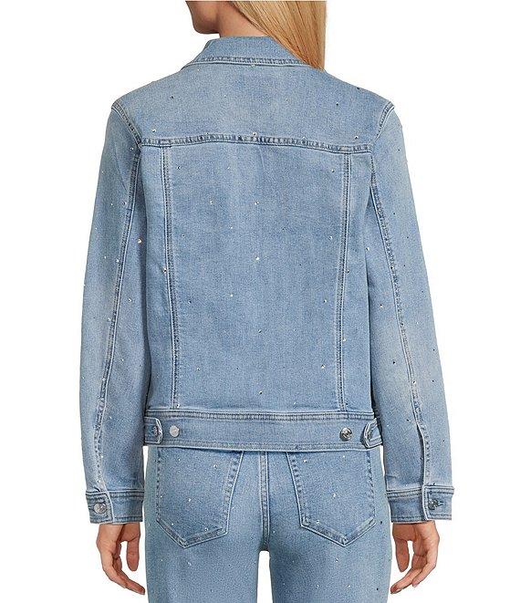 From Tommy Bahama, this jacket features: Indigo solid twill denim fabrication Heat-seal crystal embellishments Point collar Long sleeves Two front chest pockets Two side seam pockets Straight hemline Button front closure Approx. 23" length Cotton/recycled polyester/lycra spandex Machine wash/hang to dry Imported.