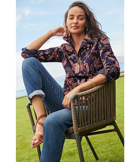 From Tommy Bahama, this popover features: Micro corduroy fabrication Point collar Long sleeves Exquisite bloom print Slight high-low hemline 2 button placket Approx. length 25.5" front, 26.5" back Cotton/spandex Machine wash/line dry Imported.