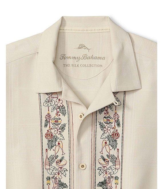 From Tommy Bahama, this shirt features: Embroidered pattern Camp collar Short sleeves Button-front closure Straight hem Silk Machine wash/tumble dry Imported.
