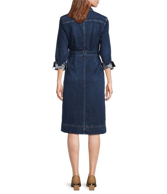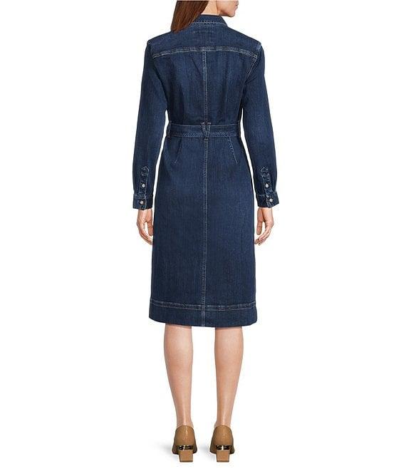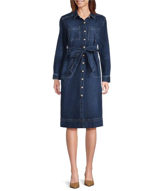 From Tommy Bahama, this dress features: Cotton denim indigo twill fabrication Shirt dress silhouette Point collar neckline Long sleeves Self tie belt Side pockets Chest pockets Straight hemline Button front closure Approx. 44" length Cotton/polyester/elastane Machine wash/line dry Imported.