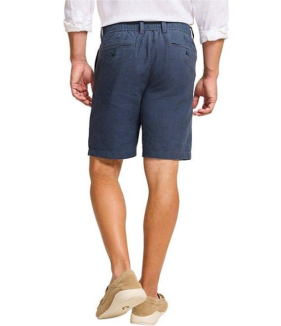 From Tommy Bahama, these shorts feature: Half elastic waist with drawcord Belt loops Button/zip closure Quarter-top front pockets Back double welt pockets 9" inseam Yarn-dyed linen/Sorona® polyester Machine wash/tumble dry Imported.