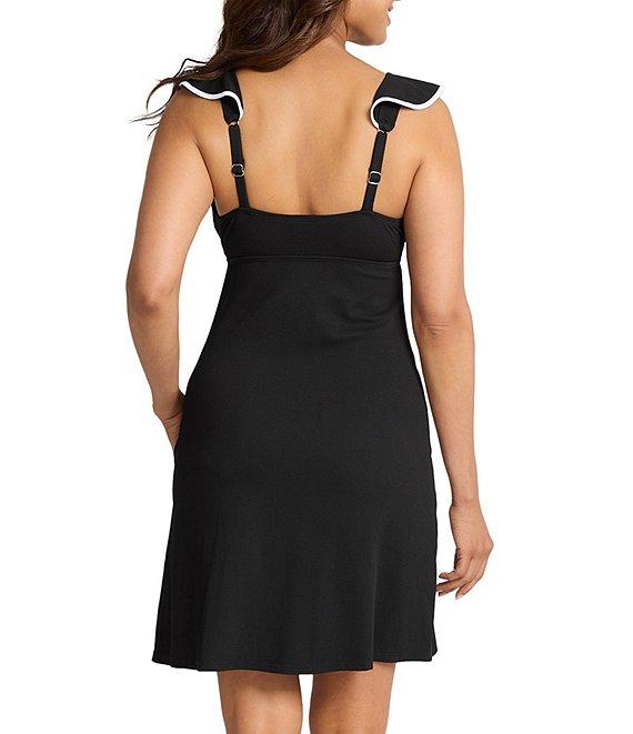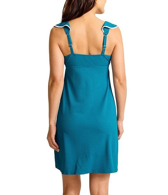 From Tommy Bahama, this swim cover-up features: A-line silhouette V-neckline Tall cups Adjustable shoulder straps Side seam pockets Ruffle detail Straight hemline Pullover construction Approx. 25.5" length Recycled nylon/spandex Hand wash Imported.