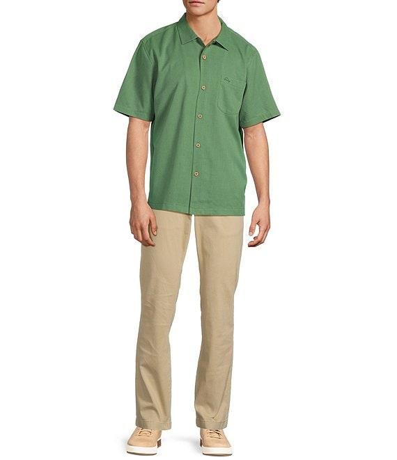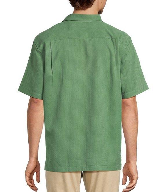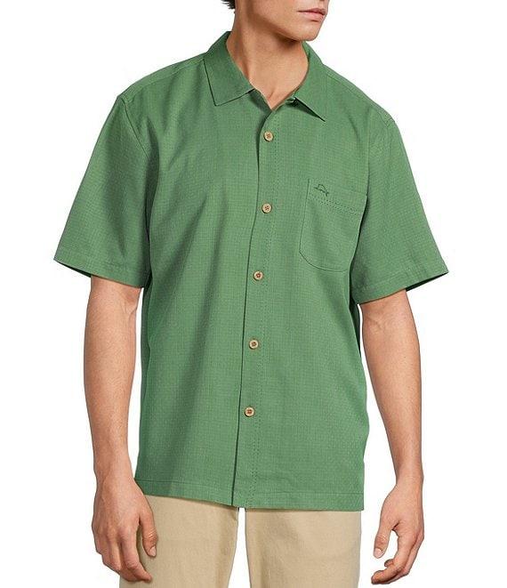 From Tommy Bahama, this shirt features: Mini-check pattern Camp collar Short sleeves Button front closure Left chest slightly curved pocket Straight hem Super soft IslandZone® fabric helps regular your body temperature with high-performance moisture evaporation Silk/Coolmax® EcoMade polyester Machine wash/tumble dry Imported.
