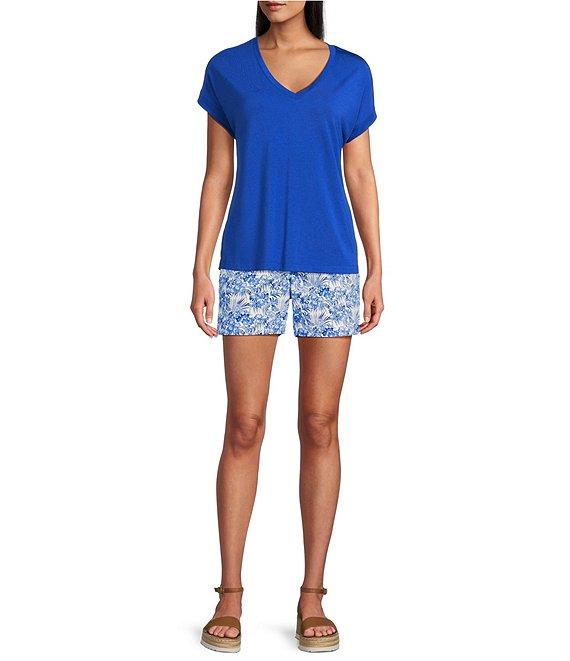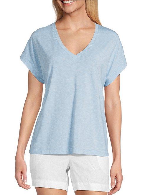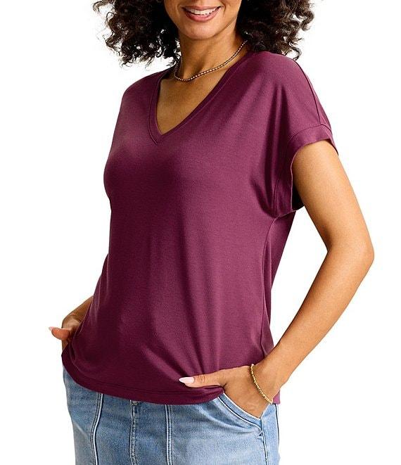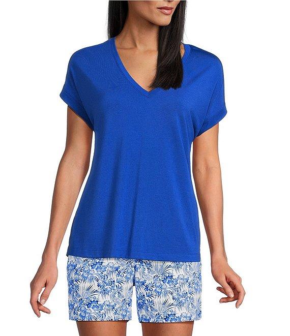 From Tommy Bahama, this t-shirt features: Stretch jersey fabrication V-neckline Short sleeves Relaxed fit Straight hemline Pullover construction Approx. 25" length Machine wash Imported.