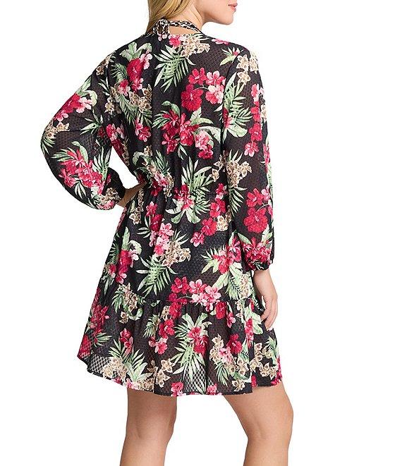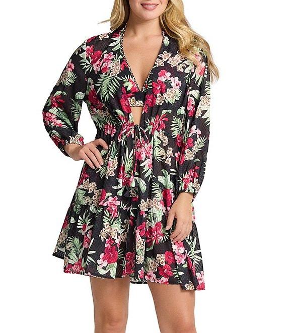 From Tommy Bahama, this swim cover-up features: Tunic silhouette Floral print open front neckline Long sleeves with elastic cuffs Tassel detail Unlined Straight hemline Adjustable self-tie waist closure Approx. 35" length Recycled polyester Hand wash Imported.
