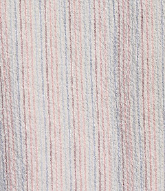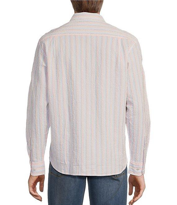 From Tommy Bahama, this shirt features: Stripe pattern Point collar Long sleeves 5-point patch pocket on the left side of the chest Button-front closure Shirttail hem Side seam gussets Stretch seersucker fabric Yarn-dyed cotton/Tencel™ lyocell/spandex Machine wash/tumble dry Imported.