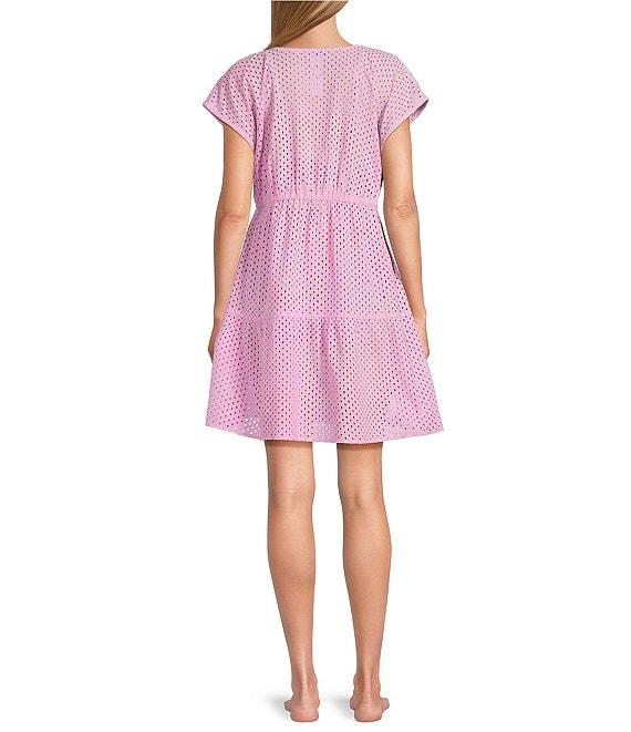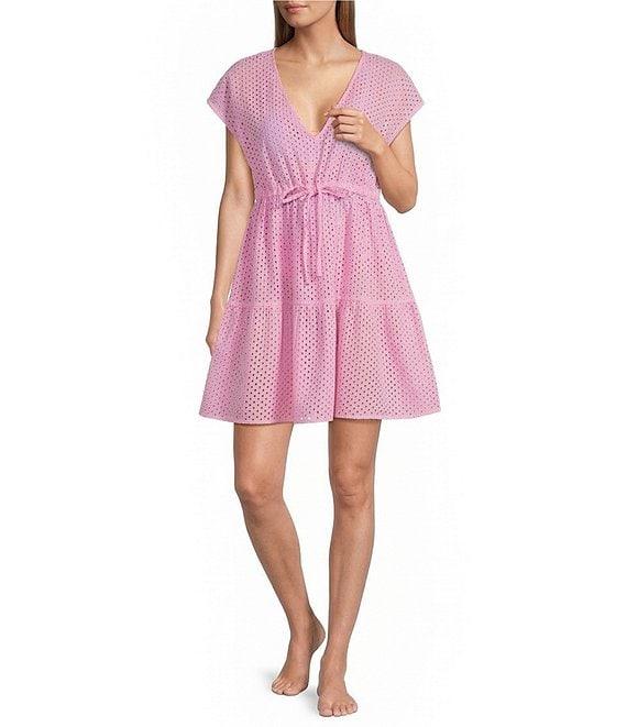 From Tommy Bahama, this swim cover-up features: Eyelet fabrication Dress silhouette V-neckline Cap sleeves Adjustable tie waist Unlined Tiered hemline Pullover construction Approx. 35" length Organic cotton Hand wash Imported.