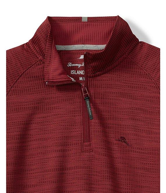 From Tommy Bahama, this pullover features: Quarter-zip closure Accent tape detail at back neck Long, raglan sleeves 2-tone texture and tonal solid color backside "Marlin" logo embroidered on the left side of chest Pullover construction Waffle knit jacquard Recycle polyester Machine wash/tumble dry Imported.