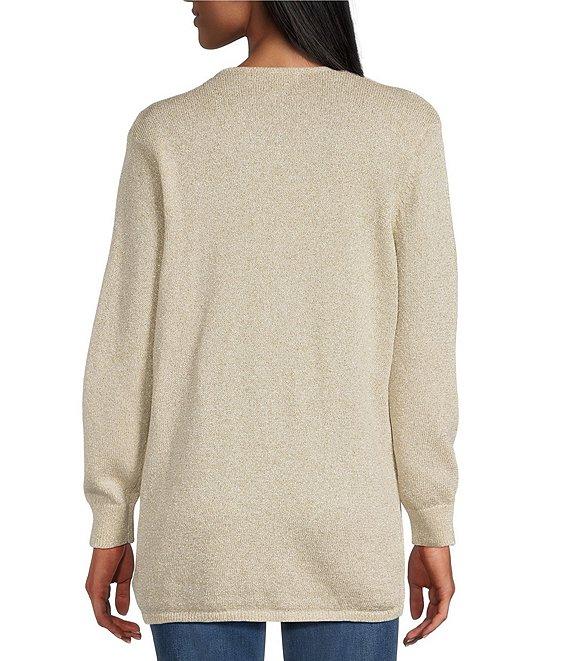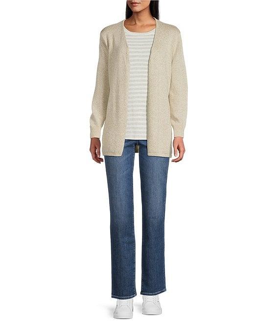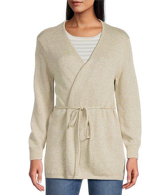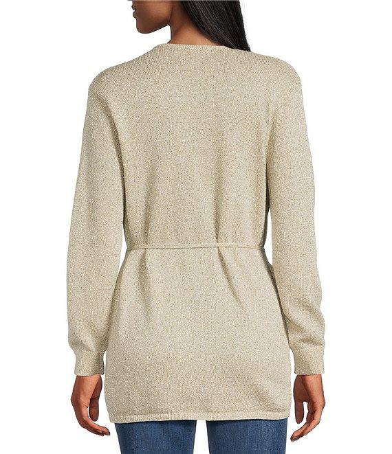 From Tommy Bahama, this cardigan features: Shimmer knit fabrication Metallic threading details Collarless Long sleeves Straight hemline Removable self tie belt Approx. 28" length Organic cotton/metallic/polyester Machine wash cold/ flat dry Imported.