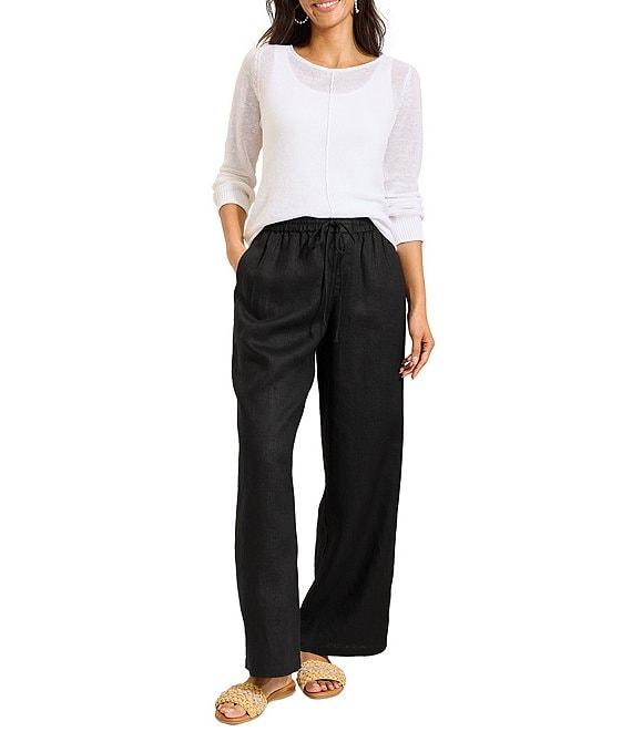 From Tommy Bahama, these pant features: Lightweight linen fabrication Flat front silhouette Elastic drawstring waistband Side pockets Ankle length Relaxed fit Pull-on drawstring closure Approx. 30" inseam Linen Machine wash/line dry Imported.