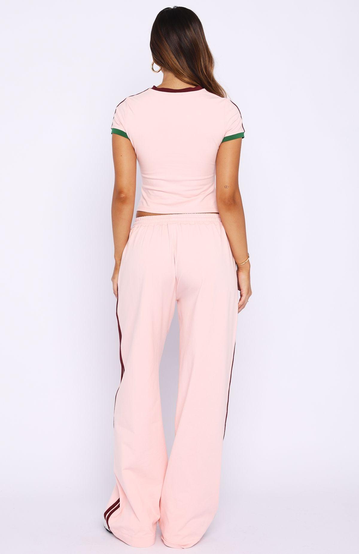 The Too Chill Track Pants Pink nails the street style look with a touch of cute. Featuring a thick elastic waistband with contrast drawstring, easy‑care wide‑leg cut, and on‑trend double side‑stripes. Side pockets add everyday practicality, and the unlined, high‑stretch fabric keeps things breezy. Pair with the matching Too Chill Baby Tee Pink!