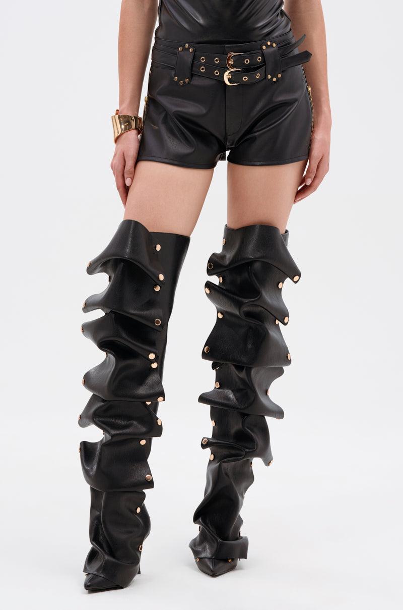 It’s not your fault you’re out of everyone’s league. The AKIRA Label Too Hot For You Faux Leather Hot Short is a sexy style crafted from supple, buttery soft vegan leather. It features a super-short, mid-rise silhouette, a curve-hugging fit, soft inner lining, and a zip-button front closure. It’s accented with gold-tone hardware throughout, including decorative side-seam zippers, flat-headed stud embellishments, and two detachable waist belts with adjustable buckle closures. - 50% Polyester, 50% PU- Hand Wash Cold- Some Stretch- Imported (all measurements approximate from size small)- 10.5” Rise- 1.5” Inseam- Model is 5’9” and wearing a size smallProduct ID: 1051785