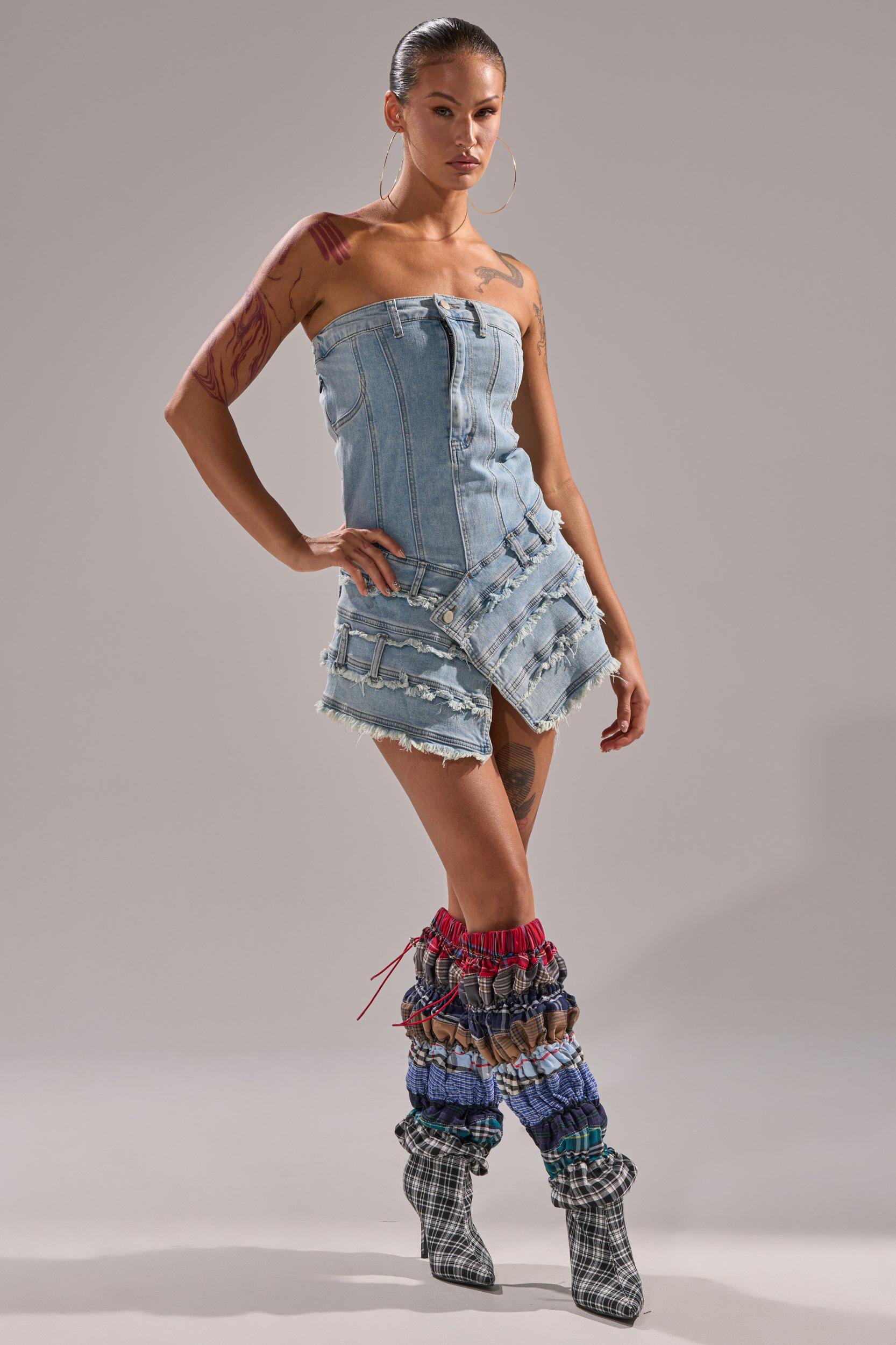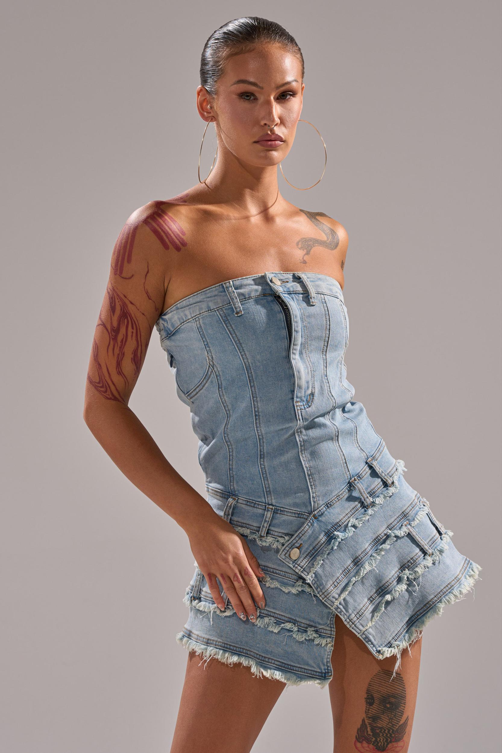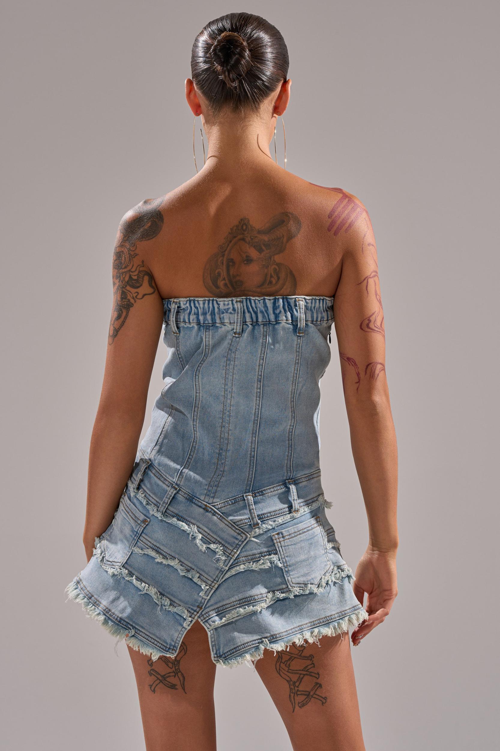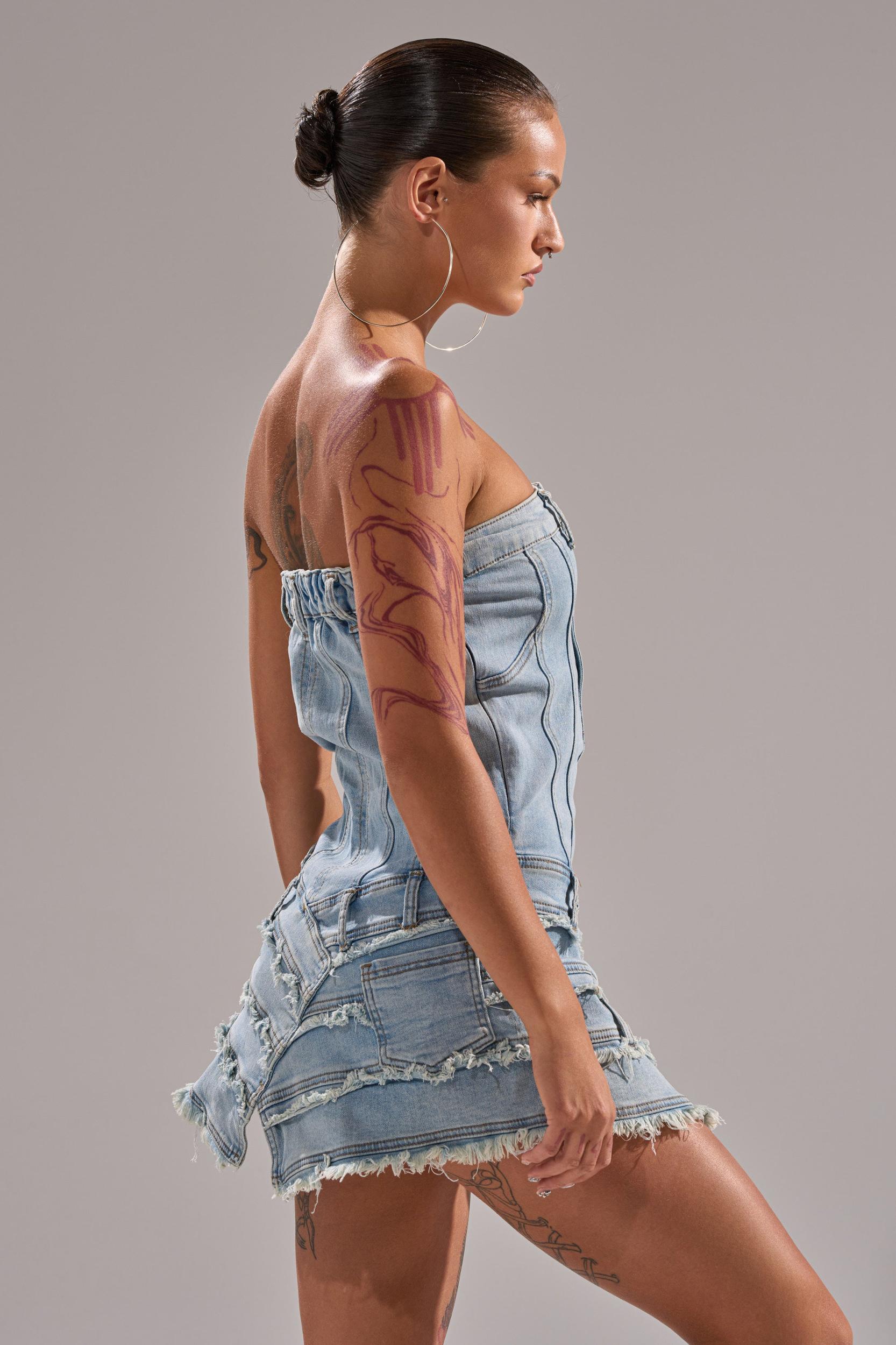 Fall head over heels for The AKIRA Label Too Much To Love Denim Romper. Crafted from light-wash denim, this statement one-piece features a strapless, sculpted bustier bodice with contour seams that accentuate your curves, layered frayed denim panels that mimic a mini skirt on the lower half, attached inner mini shorts, functional belt loops on the waist, dual rear pockets, and mock belted seam details with a front zipper-fly closure on the top hemline. Complete with a snug, mini-length fit. Pair with anything from strappy stilettos to platform sneakers to redefine casual denim with a couture twist. - 75% Cotton 15% Polyester 8% Viscose 2% Spandex- Slight Stretch- Imported (all measurements approximate from size small)- 24” Chest to Hem- 8” Rise (inner shorts)- 1.5” Inseam- Model is 5’7” and is wearing size smallProduct ID: 1064603