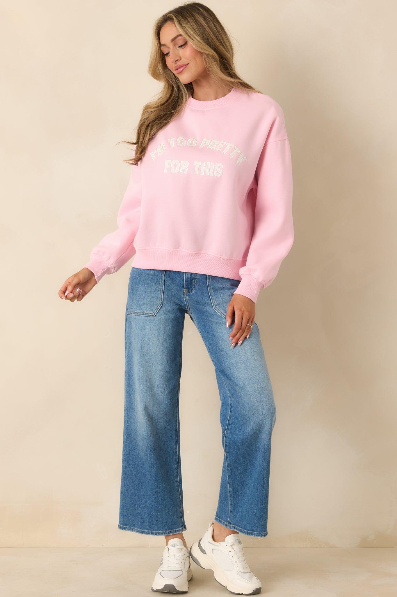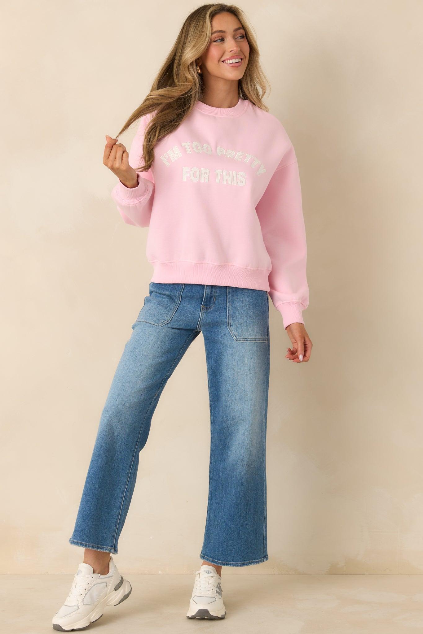 The Too Pretty For This Pink Crewneck Sweatshirt says exactly what we’re all thinking. Made for off-duty days with a little attitude, this cozy layer pairs a soft pink base with a raised embroidered message that feels playful and unapologetic. Easy to throw on, easy to style, and impossible not to smile in. This pink sweatshirt features a classic crew neckline, long sleeves, and a relaxed fit for everyday comfort. Designed with ribbed trim at the neckline, cuffs, and hem, it’s finished with an embroidered “I'm Too Pretty For This” text detail across the front. Self: 87% Polyester & 13% CottonContrast: 60% Cotton & 40% PolyesterHand Wash ColdManufactured in ChinaDesigned in the USAModel is 5'8" and wearing size x-small