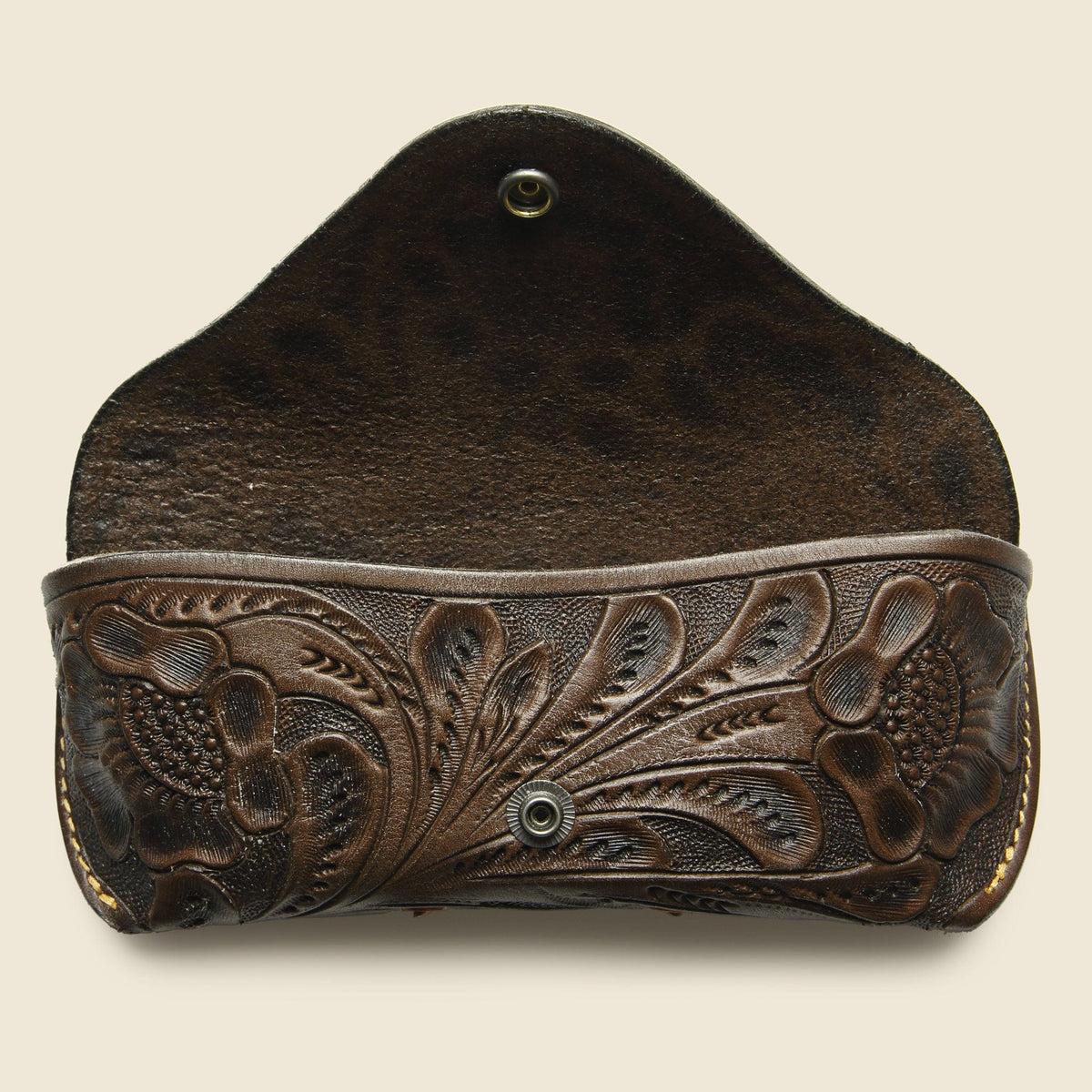 This eyeglass case from RRL is made from vegetable-tanned leather from the US and stitched with the same sturdy, American-made thread that's used in all RRL denim. Hand-tooled and burnished Southwestern-inspired pattern by artisans in Mexico. Finished with a concho snap button closure. The leather will patina beautiful
