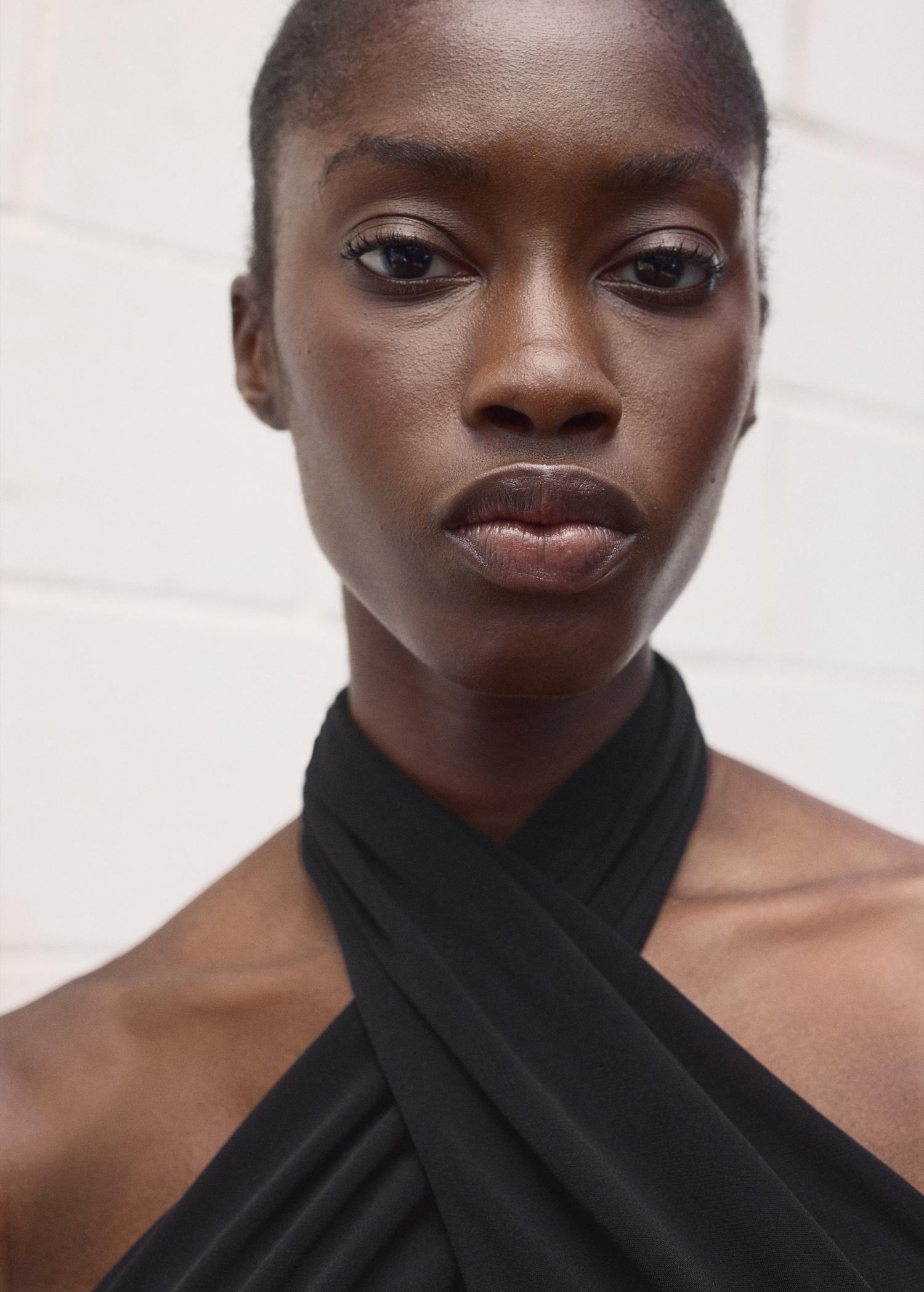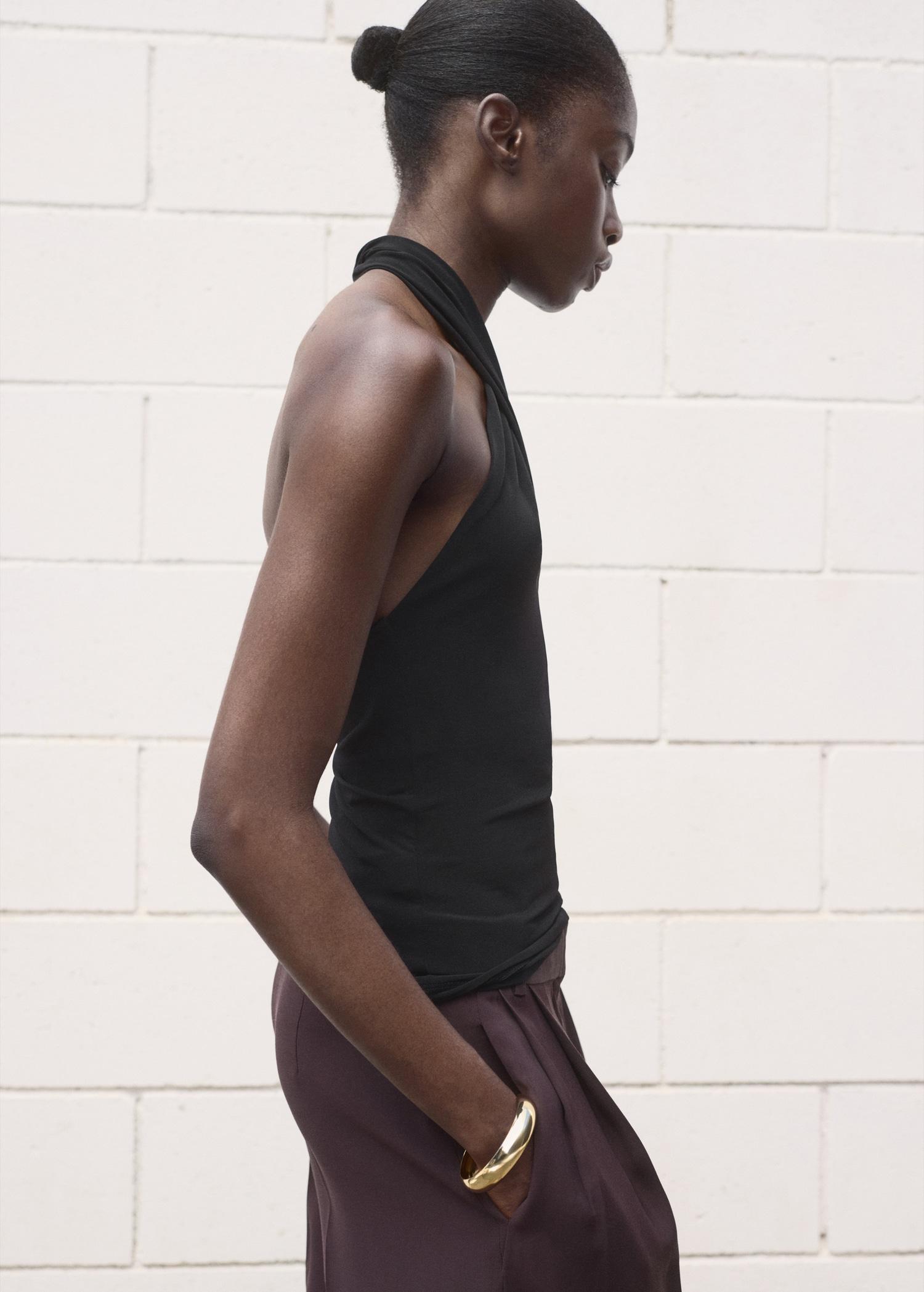 Tailored design. Halter neck. Wrap collar. Sleeveless. No closure. Side length 13.23 in. Back length 12.95 in