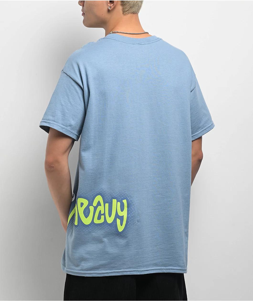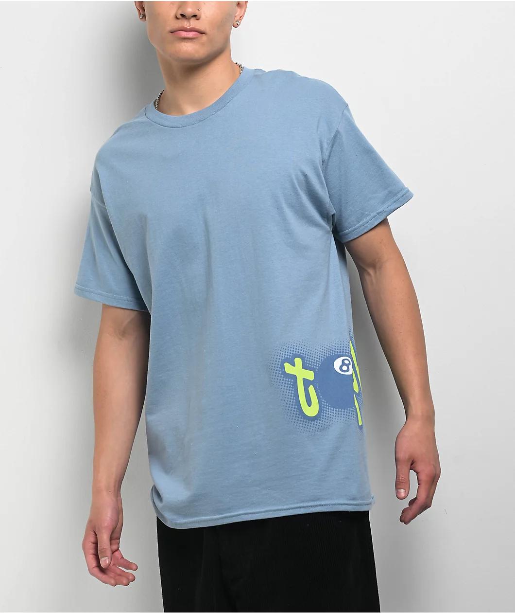 Arriving in a blue "Slate" grey, the Eight Ball t-shirt from Top Heavy adds a streetwear vibe to any outfit. Green and blue branding script with an Eight Ball in place of the letter "O" in the bottom left spills over onto the back for a unique look.