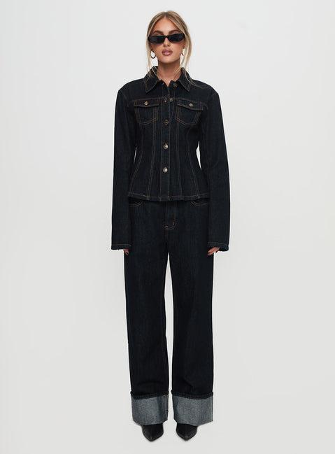 Low-rise baggy cuffed denim jeans Dark washed, contrast stitching, belt looped waist, button & zip closure, five-pocket, straight leg Non-stretch material, unlined 100% cotton Cold hand wash Size down for a mid-rise