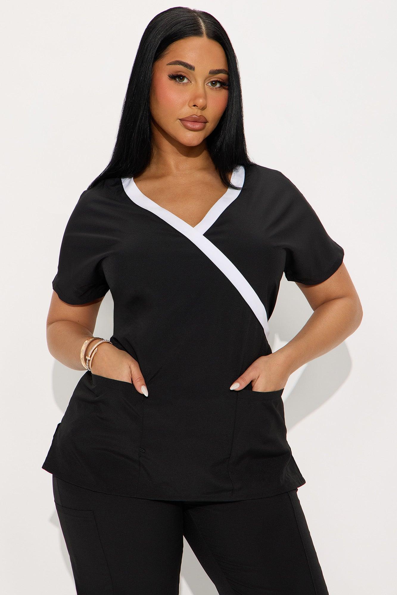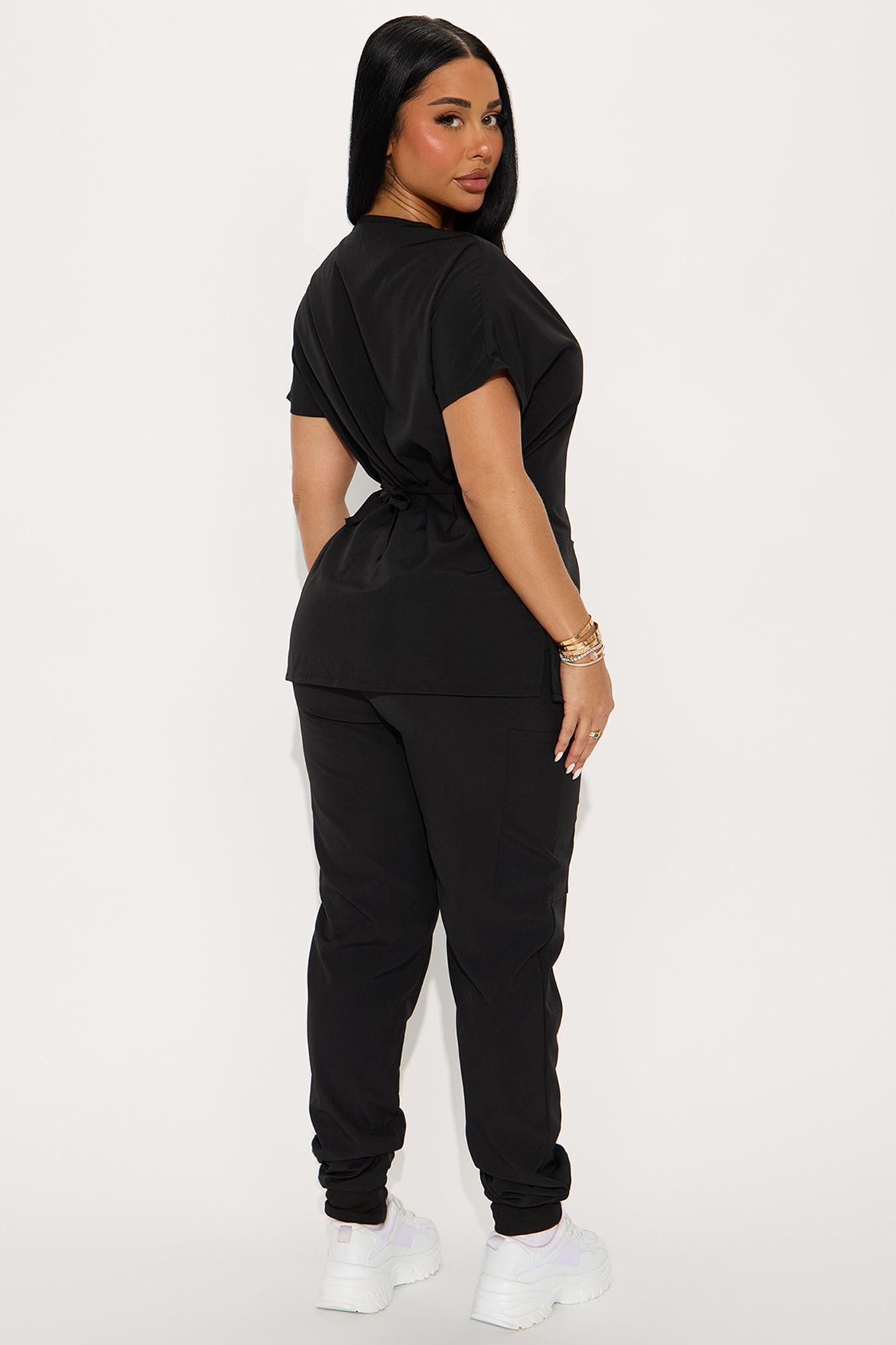 Available In Black, Blue And Charcoal. Uniform Scrub Set Short Sleeve Mock Wrap Detail Tie Back Detail Front Pocket Detail Matching Cargo Pants Drawstring Detail Cargo Pockets Cuffed Detail Stretch Final Sale 96% Polyester 4% Spandex Imported