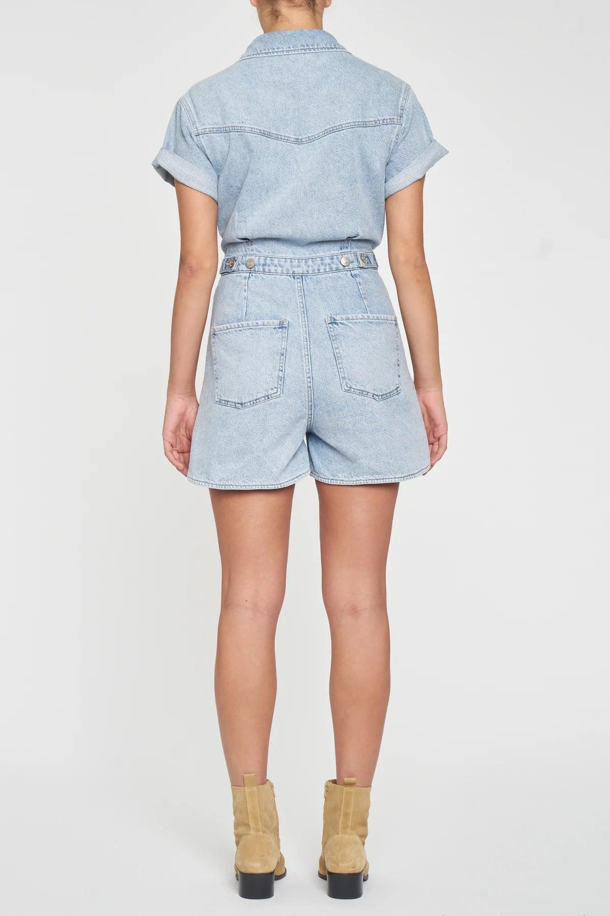 A brand new addition to Daze - a denim romper. Created from a non stretch fabric, this romper features a snap front with a curve defining elastic waist.
