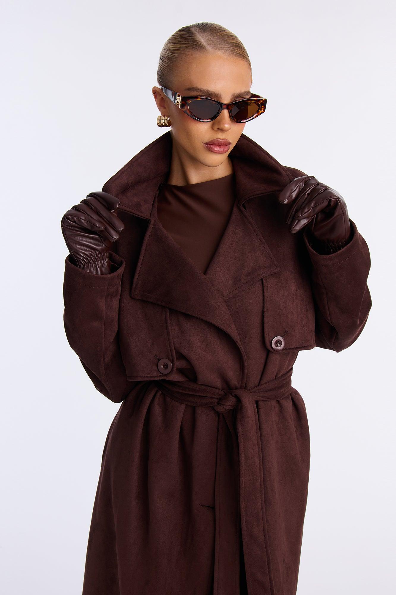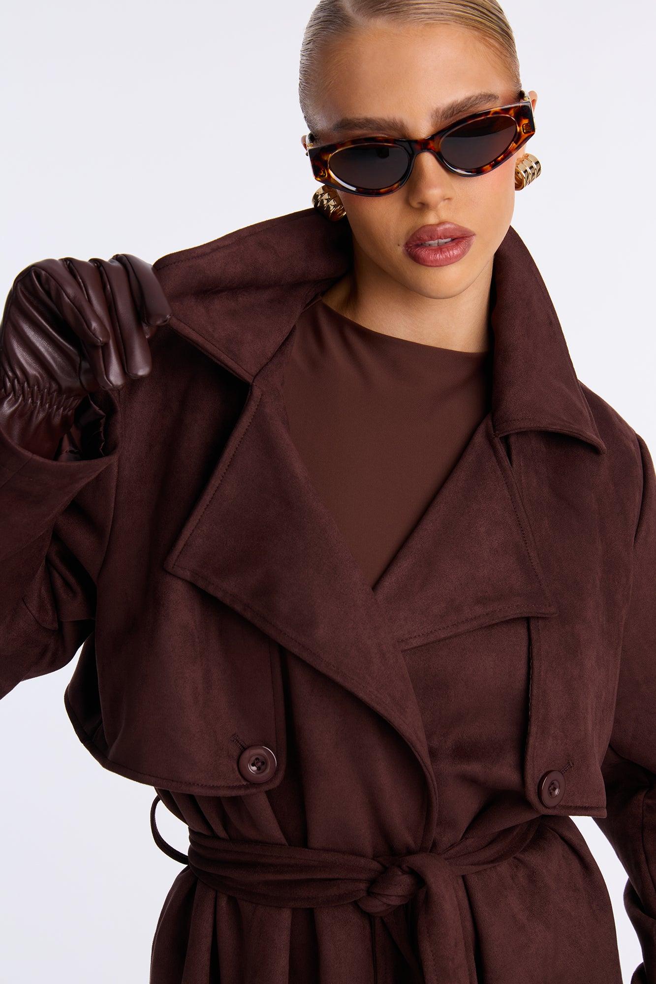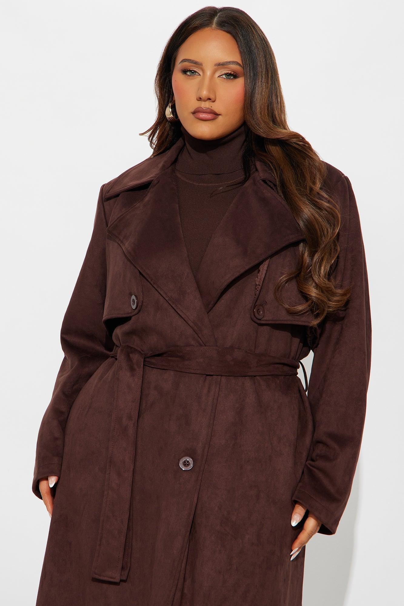 Available In Black, Chocolate, Fuchsia And Lavender. Faux Suede Trench Coat Collar Neckline Long Sleeve Button Closure Tie Waist Fully Lined Self: 96% Polyester 4% Spandex Lining: 100% Polyester Imported California Proposition 65WARNING: Cancer and Reproductive Harm - www.P65Warnings.ca.gov.