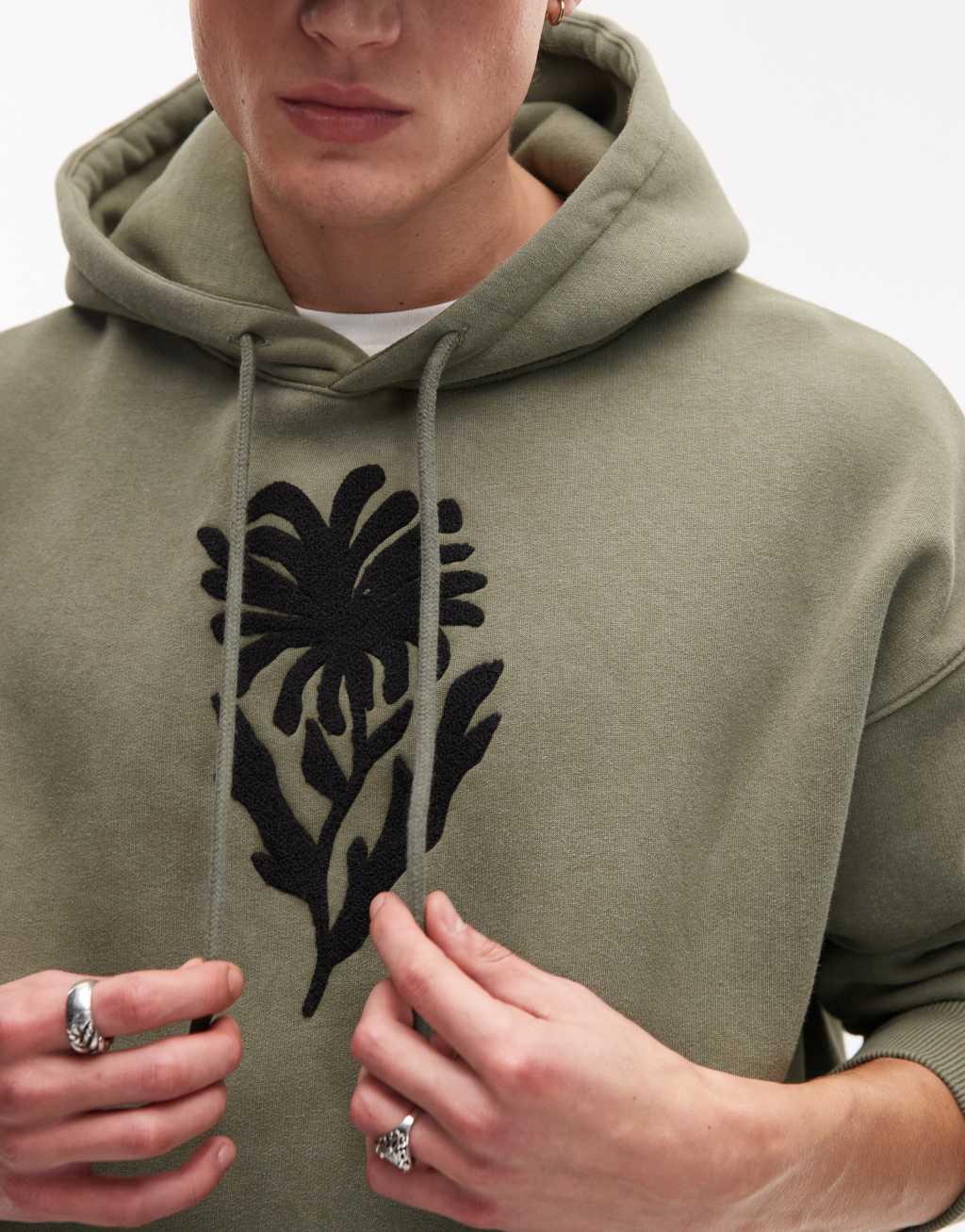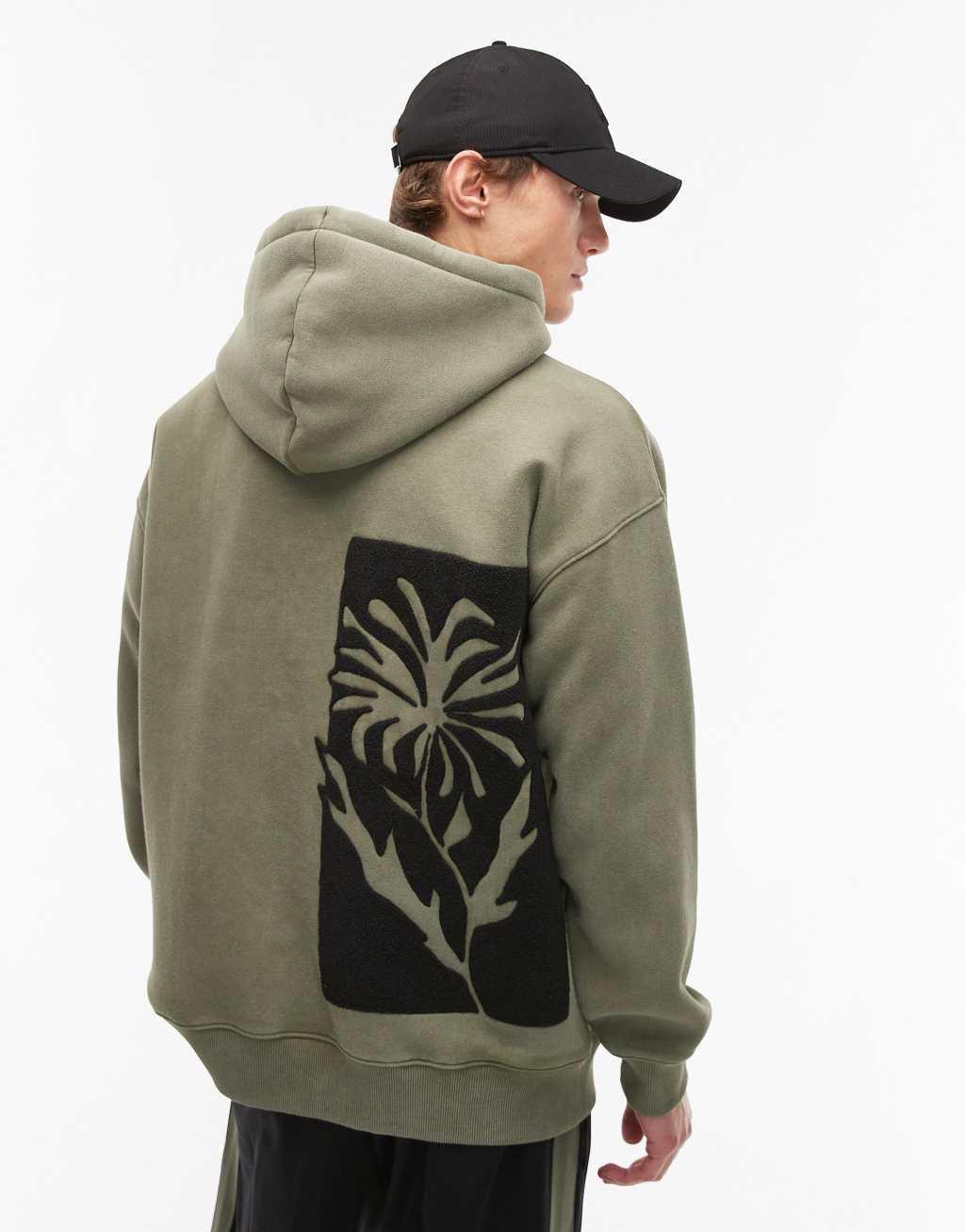 Topman oversized fit hoodie with front and back floral block chenille embroidery in washed khaki