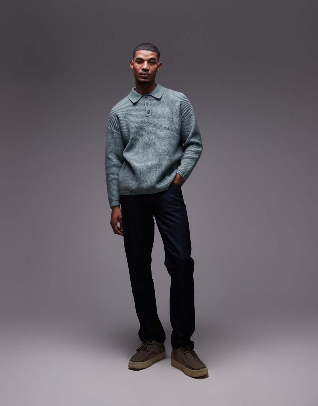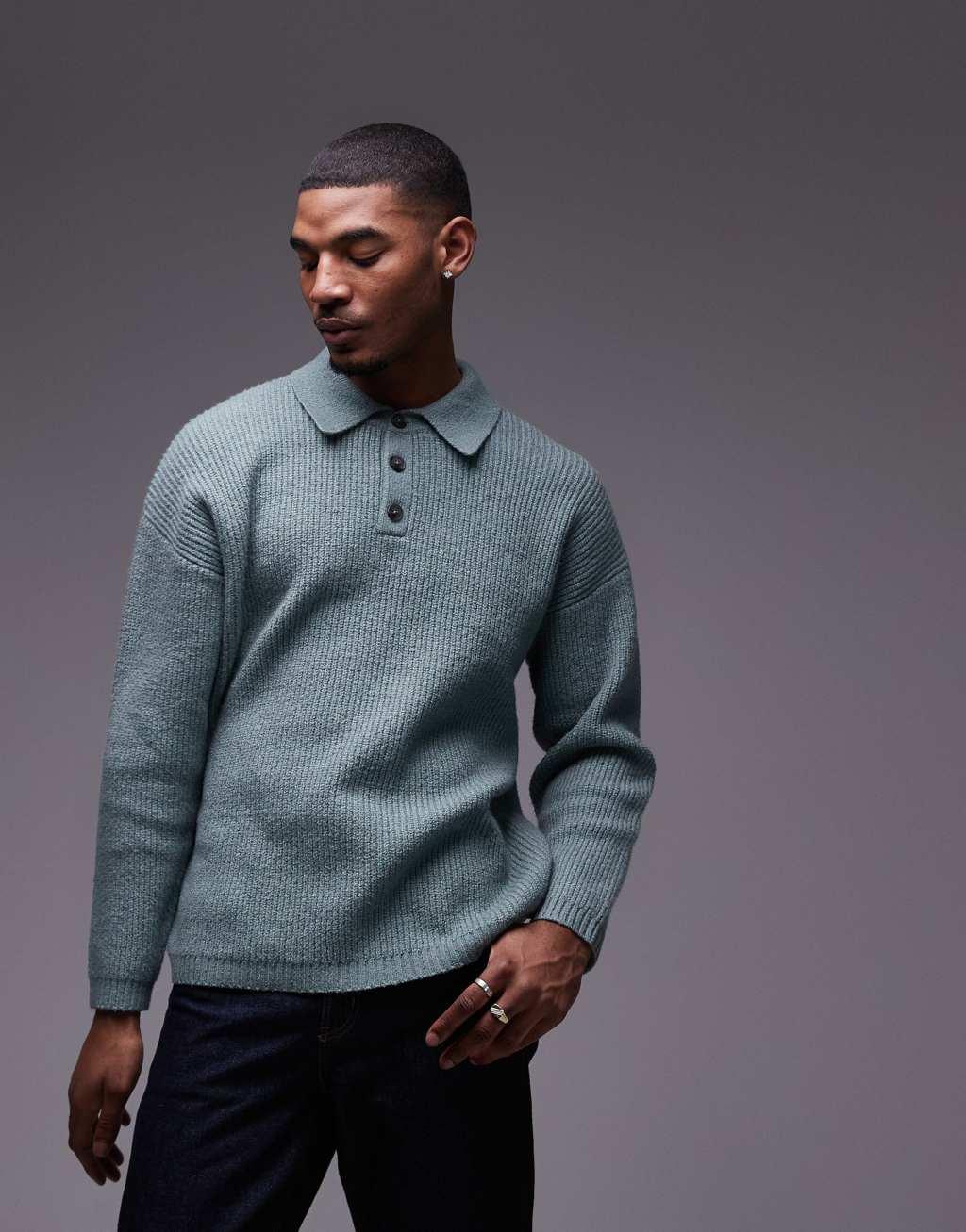 Topman relaxed fit compact knit polo sweater in sage