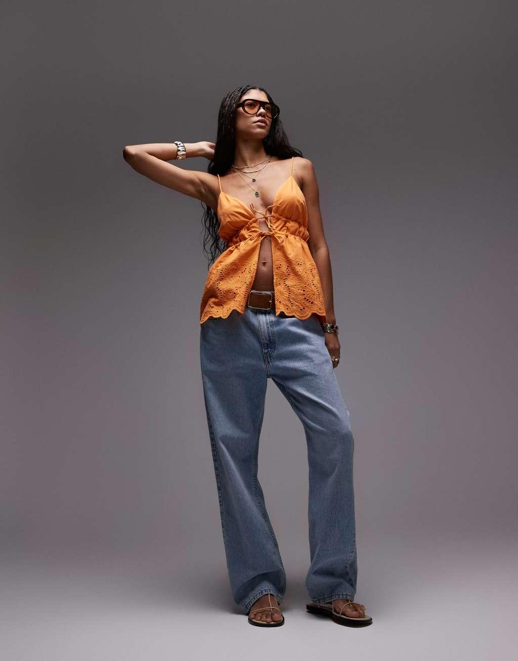 Topshop cutwork tiered tie front cami top in orange