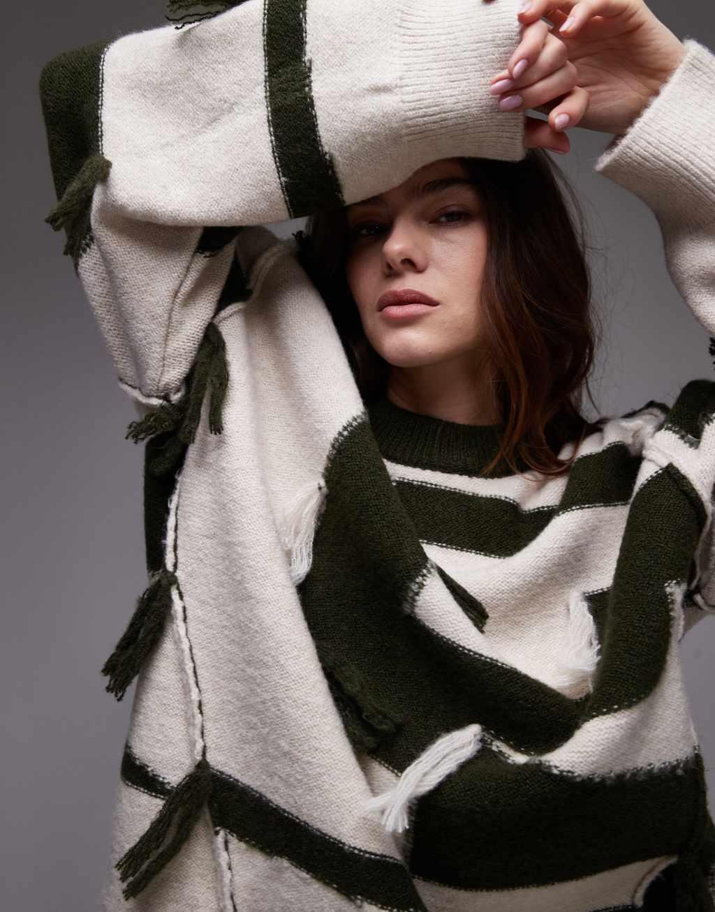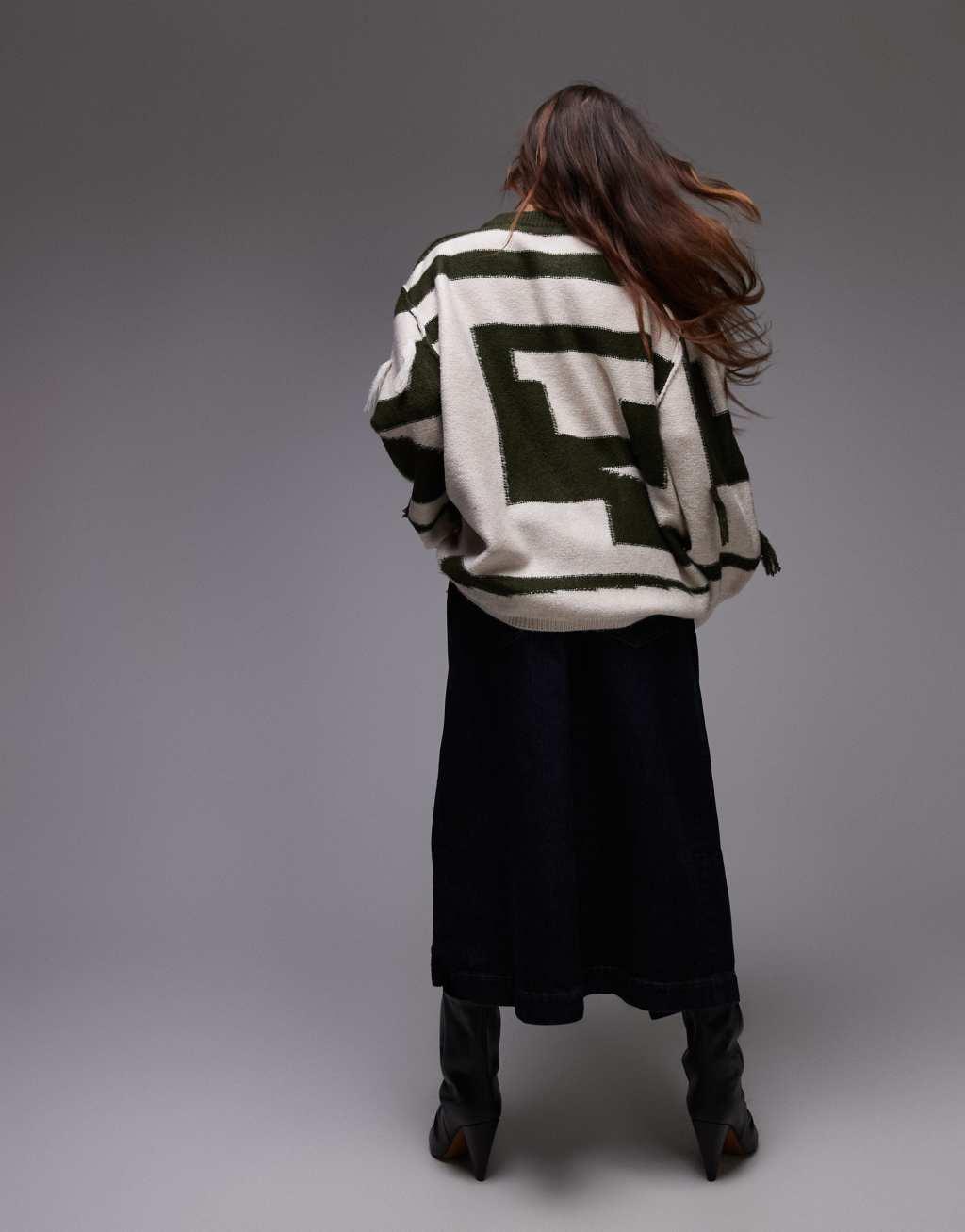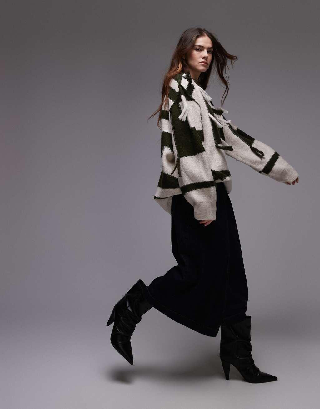 Topshop knit tassel patchwork oversized sweater in green and ecru