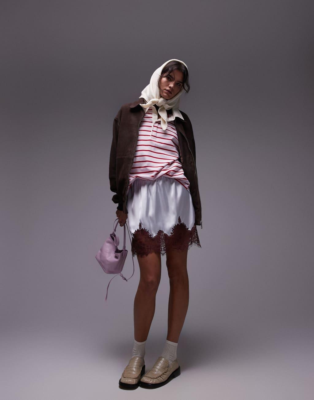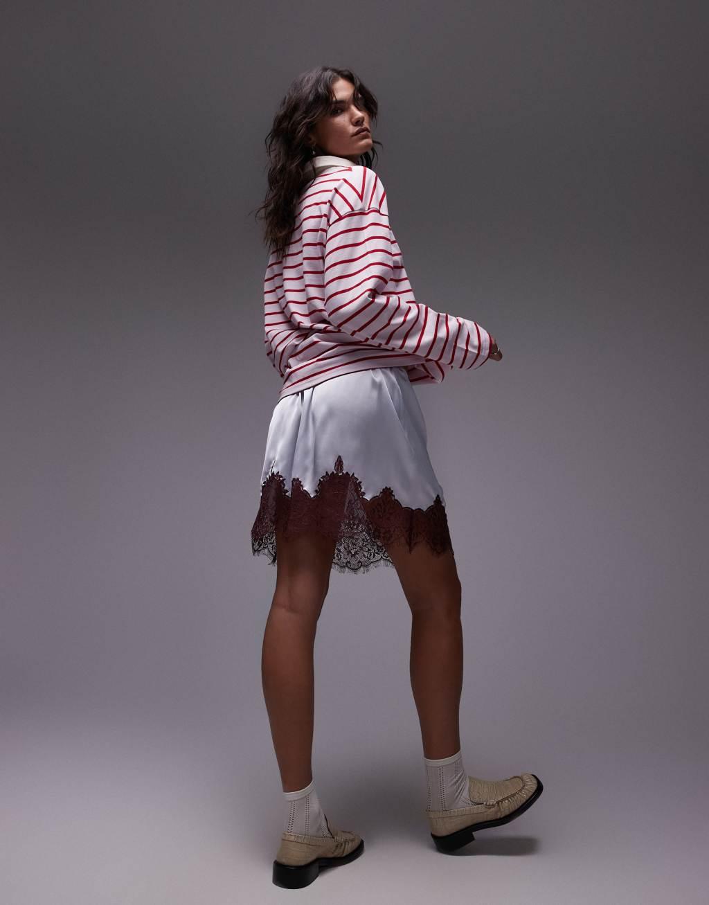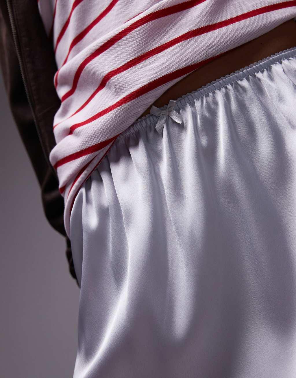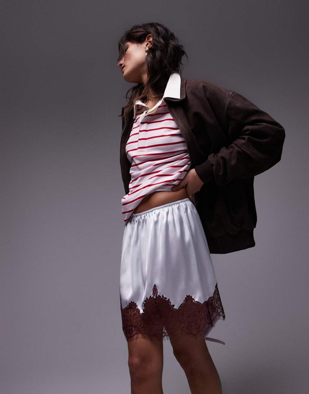 Topshop satin lace petticoat in silver blue with burgundy lace