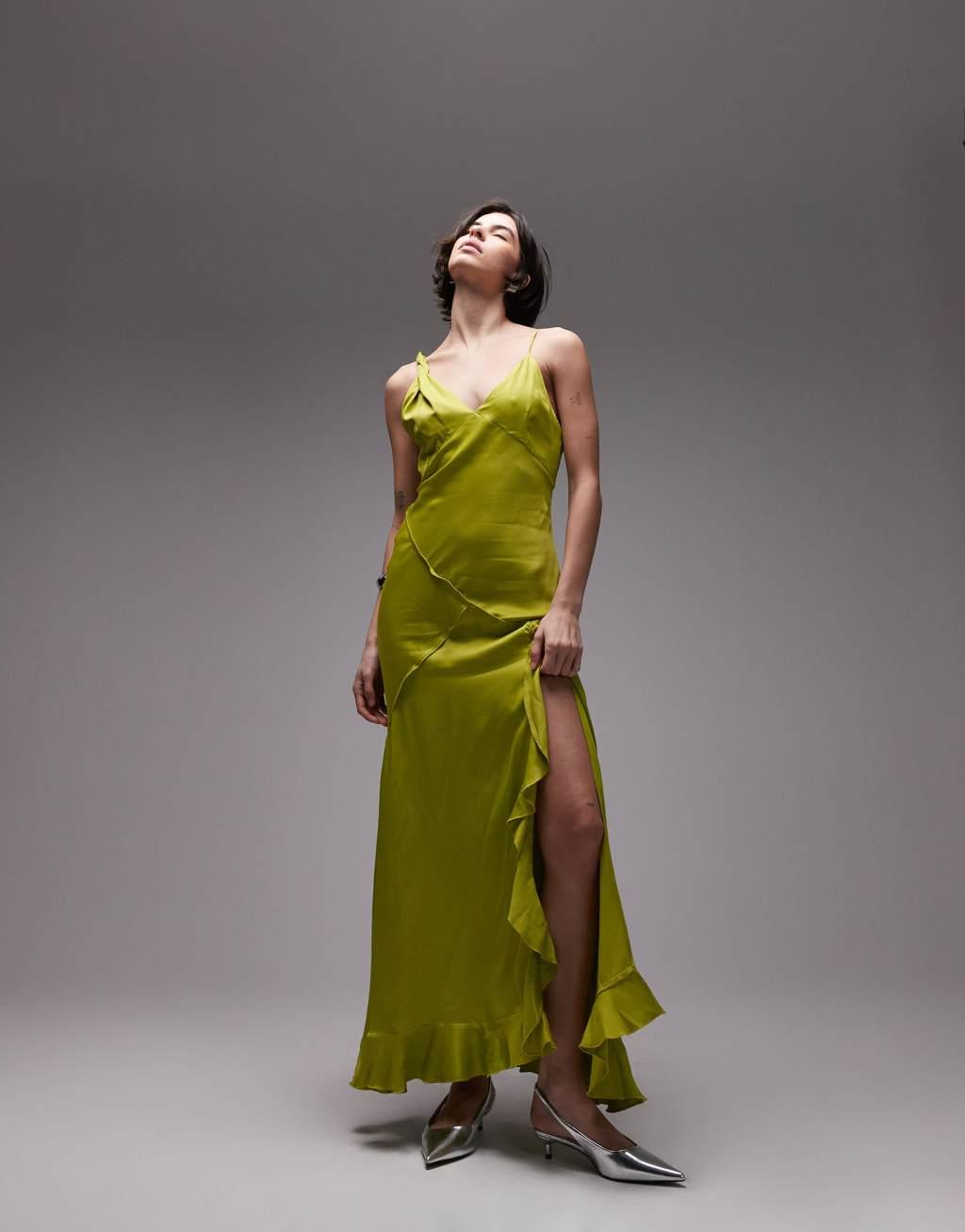 Topshop twist shoulder exposed seam midi slip dress in lime green
