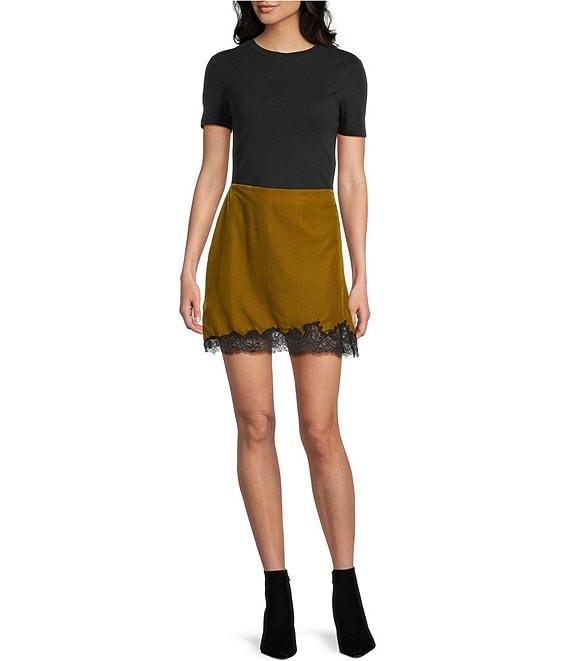 From TOPSHOP, this skirt features: Velvet fabric Pull-on styling Mini length Lace trim A-line silhouette Polyester/cotton Machine wash/line dry Imported.