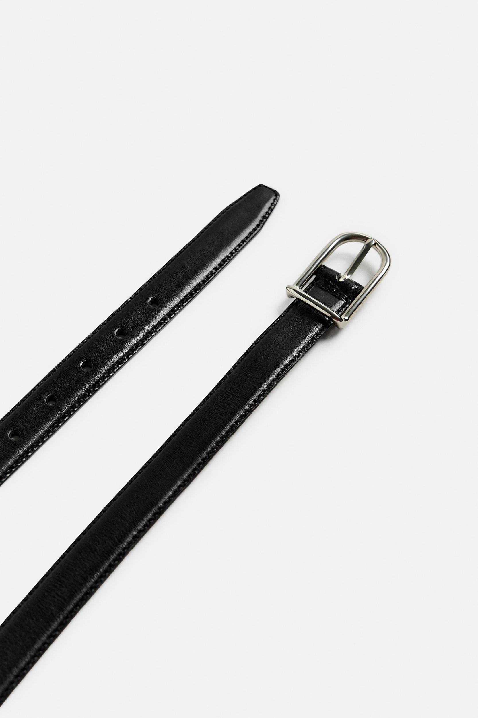Belt made of contrasting leather and fabric. Edges with tonal topstitching detail. Metal buckle and keeper closure. Width: 4 cm.