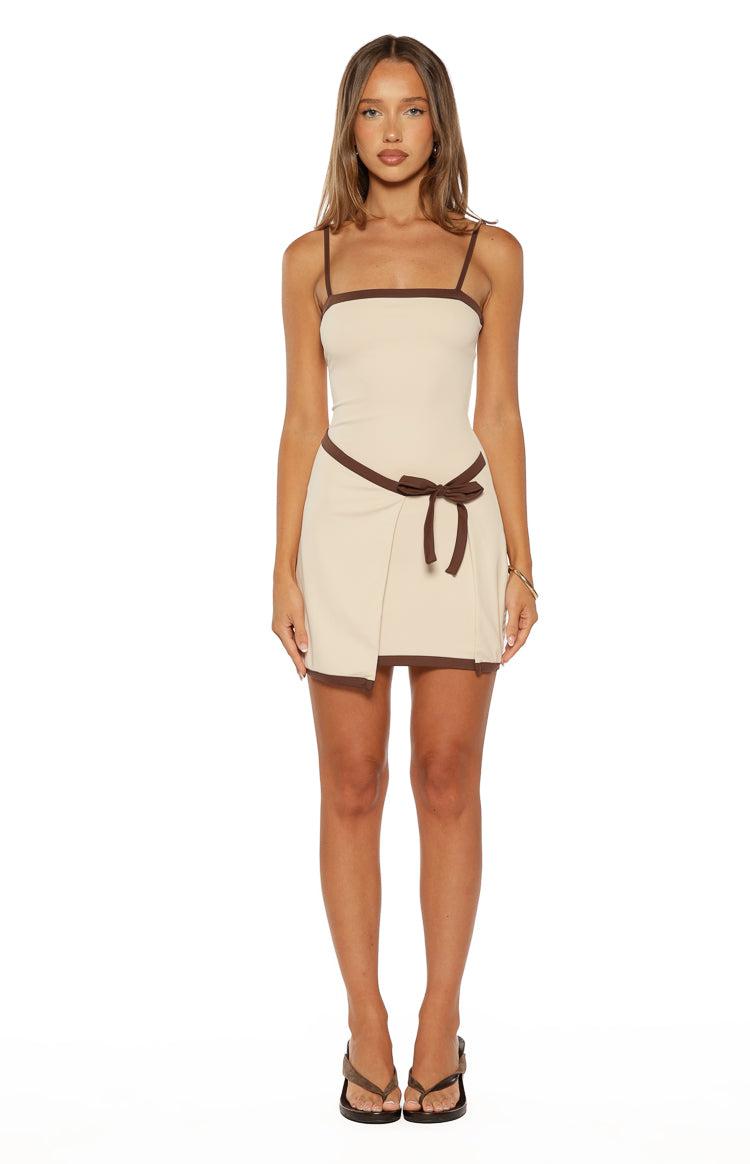 Cream Wrap Tie Jersey Mini Dress How to style:Elevate your everyday wardrobe with our Tora Wrap Tie Mini Dress, a versatile staple for casual lunches and city strolls. Designed in comfortable stretch jersey, it features a straight neckline with contrast bind detailing and a flattering functional front tie. Throw on white sneakers and an oversized denim jacket for an easy, cool-girl aesthetic. Features: Mini length Fully lined Straight neckline Adjustable straps Contrast bind detail Front wrap panel Functional front tie Pull on style Stretch jersey material Perfect for summer, casual outings, and weekends!