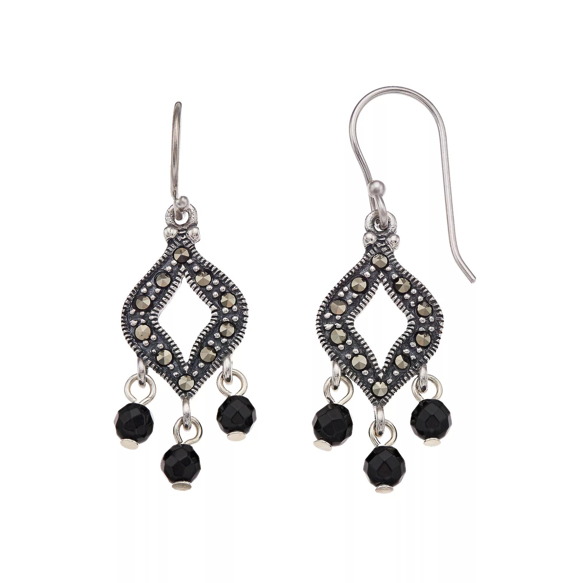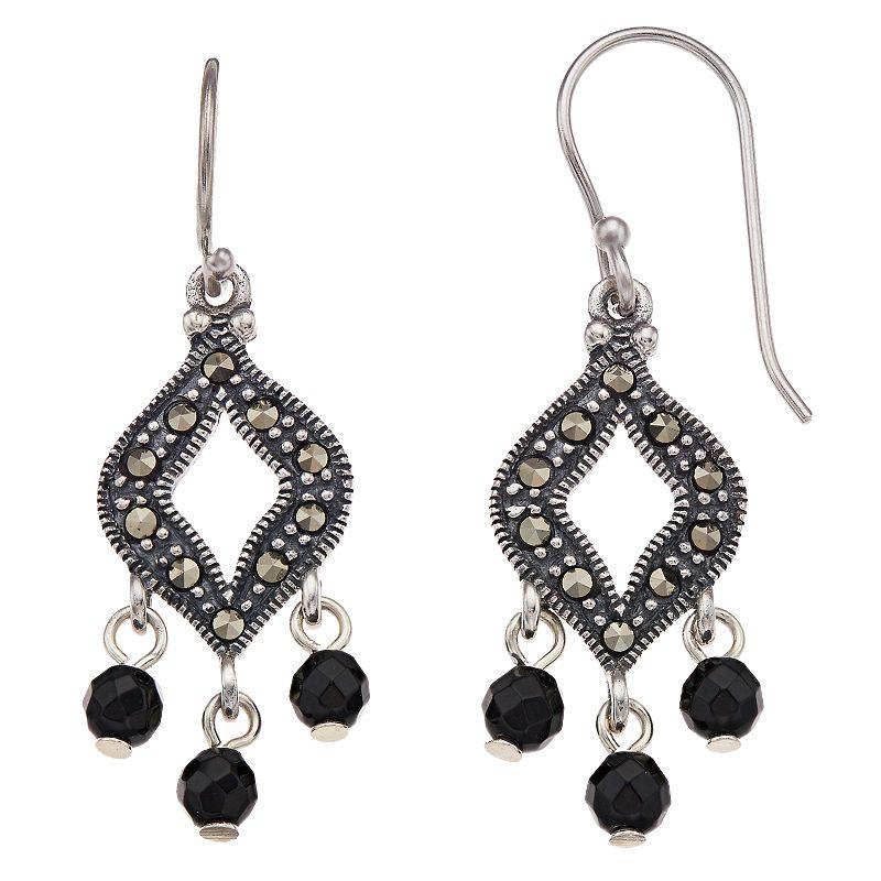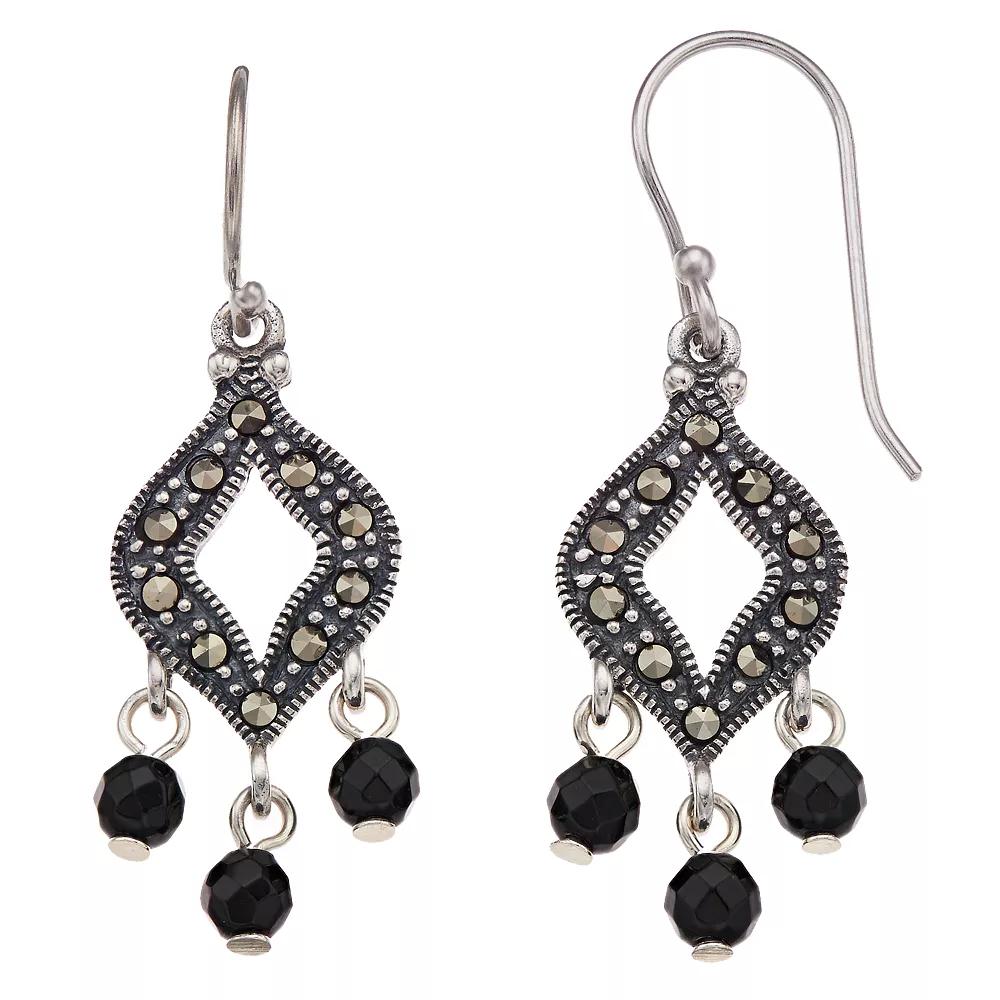 These Tori Hill drop earrings feature marcasite and onyx stones for bold style. EARRING DETAILS Length: 1 1/2-in. Backings: fishhook Metal: sterling silver Finish: antiqued Packaging: boxed GEMSTONE DETAILS Stone type: marcasite Center stone size: 4mm Shape: round Color: gray, black Gemstones may have been treated to enhance their appearance. Special care may be required. Please visit our Gemstone Treatment & Special Care Guide for more information. Image(s) may be enlarged to show detail. Gender: female. Age Group: adult.
