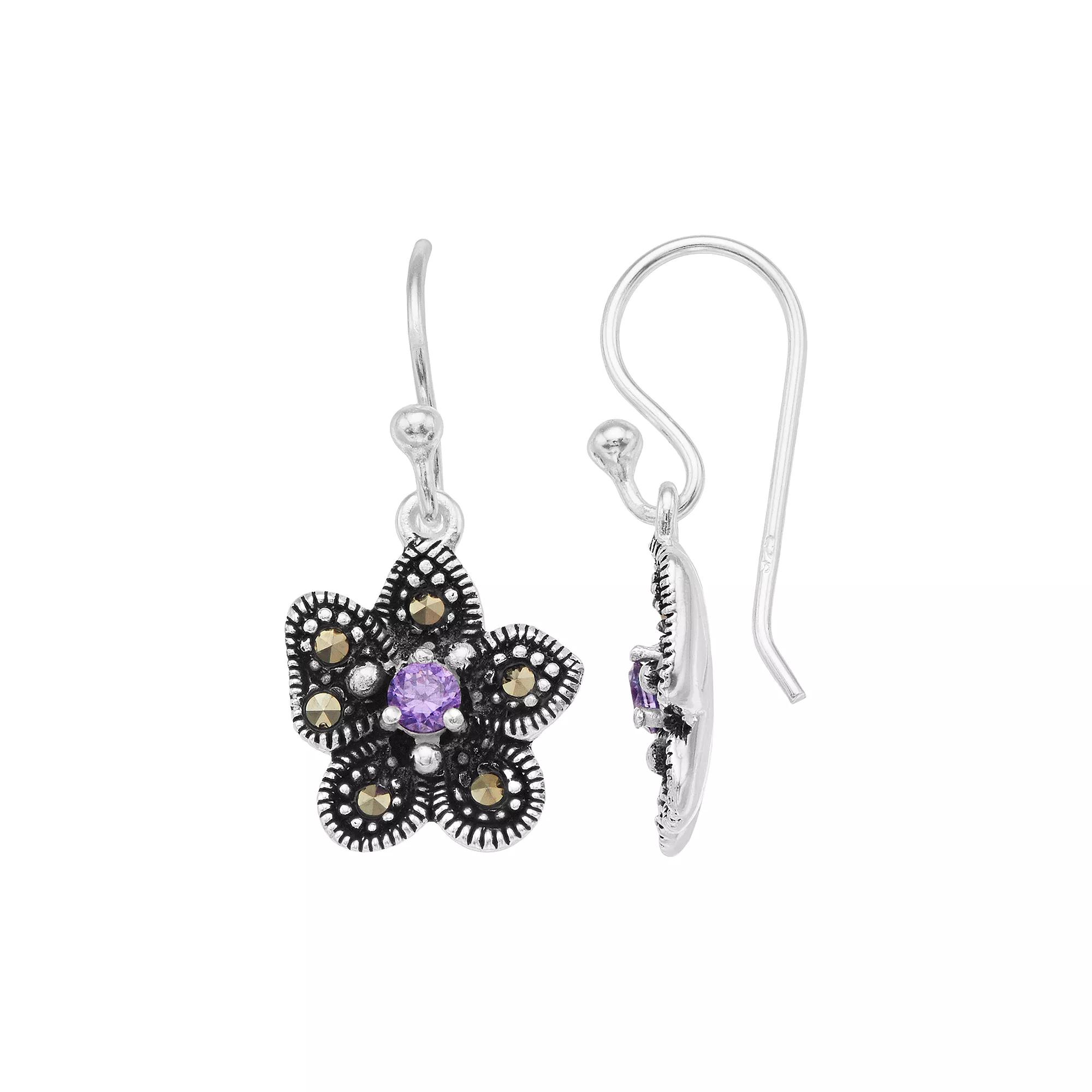 These Tori Hill flower drop earrings are a refreshing addition to any look. These Tori Hill flower drop earrings are a refreshing addition to any look. EARRING DETAILS Length: 1-in. Backings: fishhook Metal: sterling silver Finish: antiqued Packaging: boxed STONE DETAILS Stone type: marcasite & glass Color: purple & gray Shape: round Gemstones may have been treated to enhance their appearance. Special care may be required. Please visit our Gemstone Treatment & Special Care Guide for more information. Size: One Size. Gender: female. Age Group: adult.