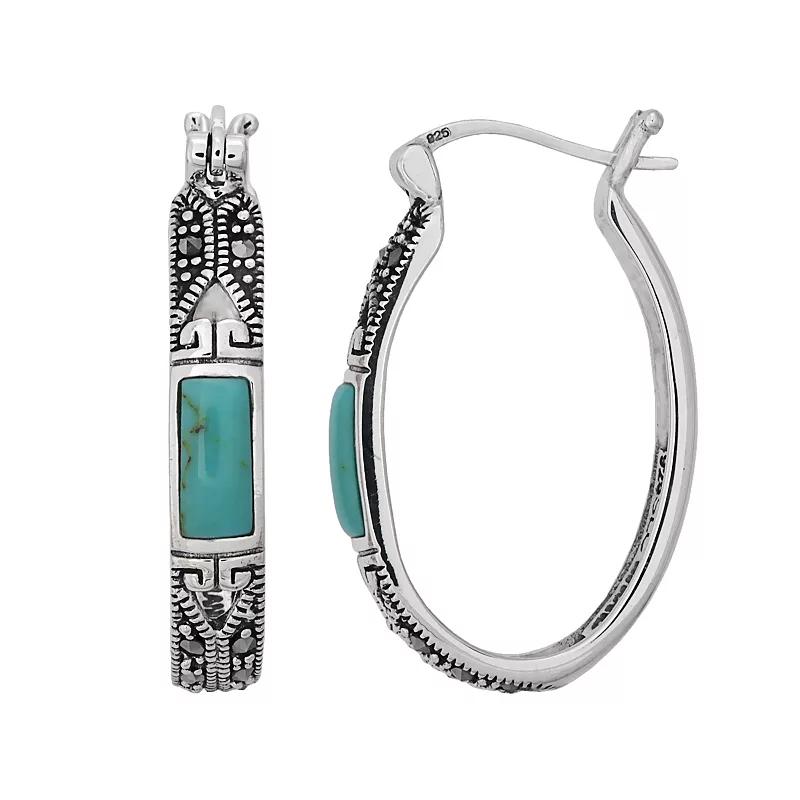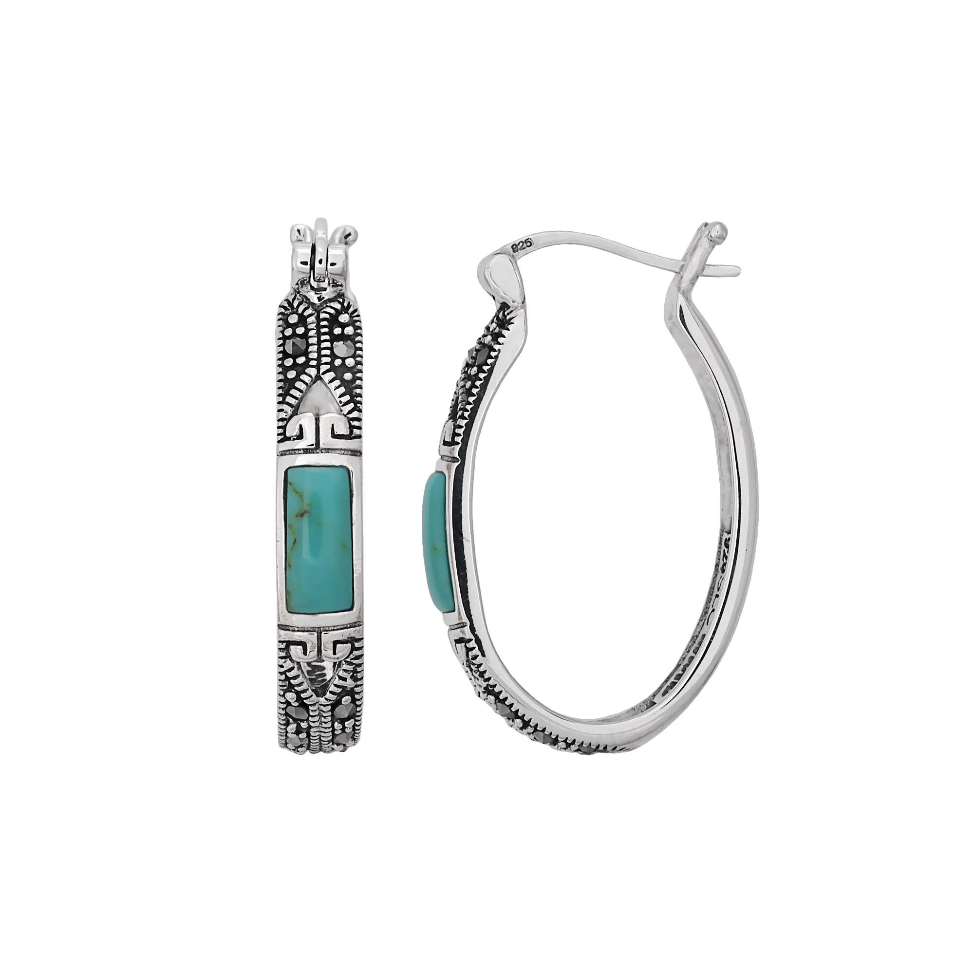 Youll love the vintagelook of these simulated turquoise and marcasite oval hoops.Earring Details: Length: 1.12 in. Backings: click-it Metal: sterling silver Features: milgrain detailsStone Details: Stone type: simulated turquoise, marcasite Cut: rectangle cabochon, round Setting: bezel, prong Size: One Size. Color: White. Gender: female. Age Group: adult.