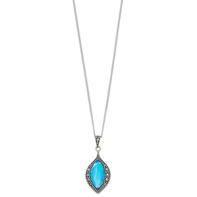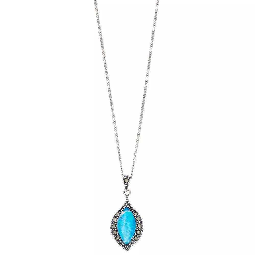 Featuring a marquise pendant emphasized with a simulated blue opal center stone and marcasite accents, this Tori Hill necklace is a fascinating find. PENDANT DETAILS Pendant length: 1 in. Chain length: 18 in. Chain type: curb Clasp: spring-ring Metal: sterling silver Finish: antiqued Packaging: boxed Size: 18". Gender: female. Age Group: adult.