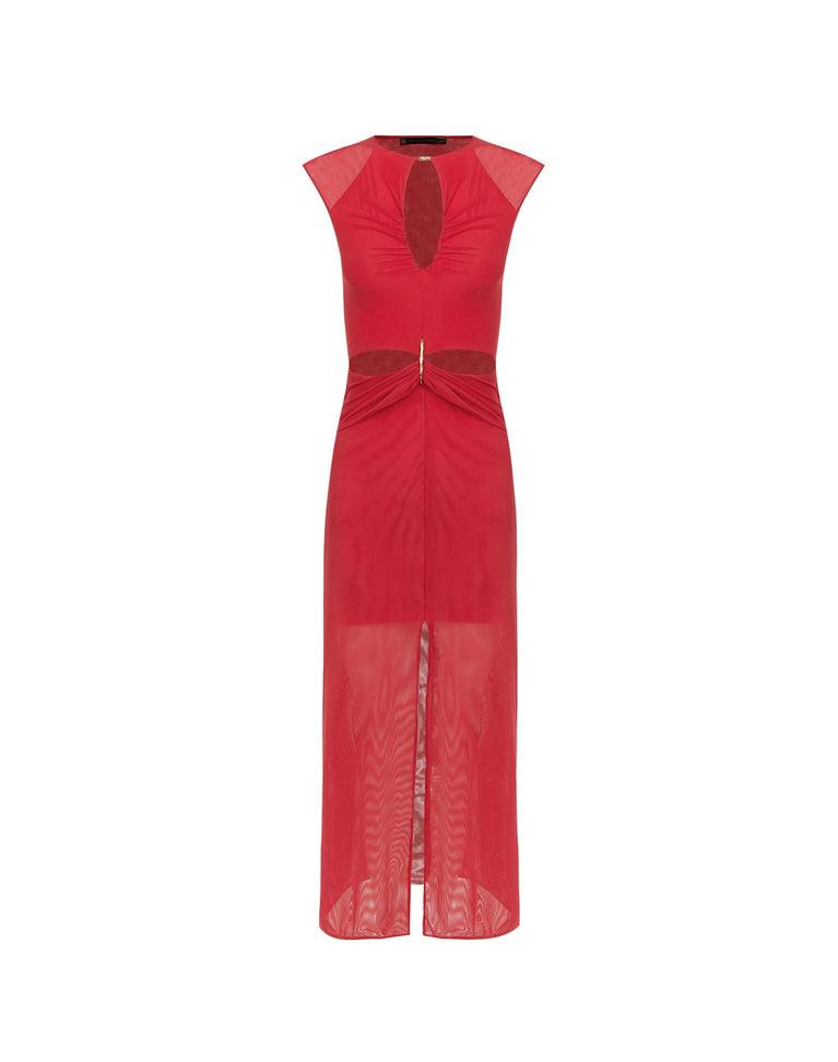 Mesh dress with a keyhole neckline, graceful draping on both the bust and skirt, a waistband cut-out, and a front center slit. Enhanced by 24k gold-plated metal accents, this piece exudes elegance and style. A versatile option that works for daytime and casual looks with flats, or for more formal evening looks with high-heeled sandals. Features: Keyhole neckline Drapped details Button and zipper closure 24k gold-plated accents Waistband cut-out Front slit Style# 371-858-005