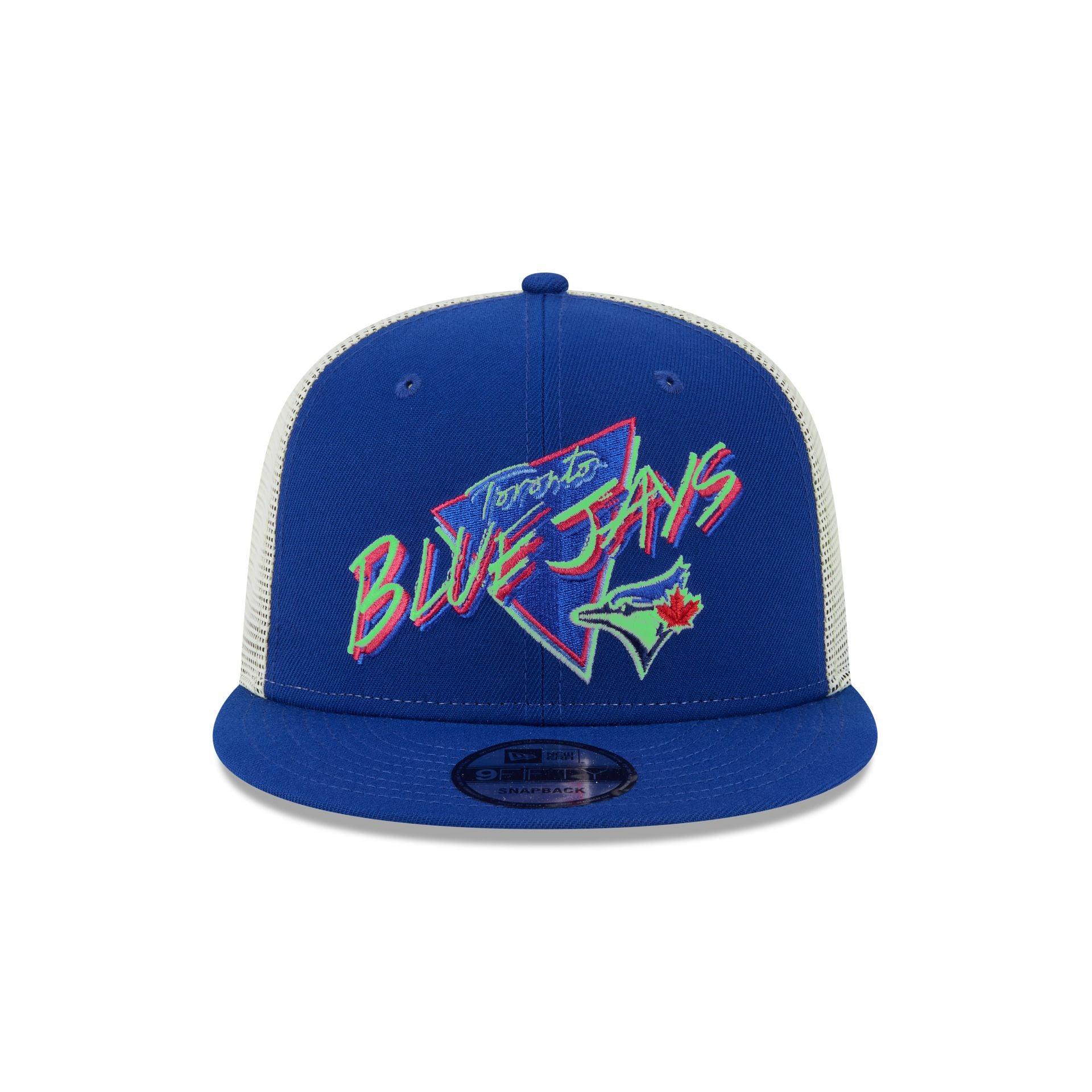 The Toronto Blue Jays Glow-In-The-Dark 9FIFTY Trucker features an embroidered Blue Jays glow-in-the-dark logo and wordmark at the front panels. Additional details include a snapback closure at a glow-in-the-dark mesh rear and a gray undervisor.