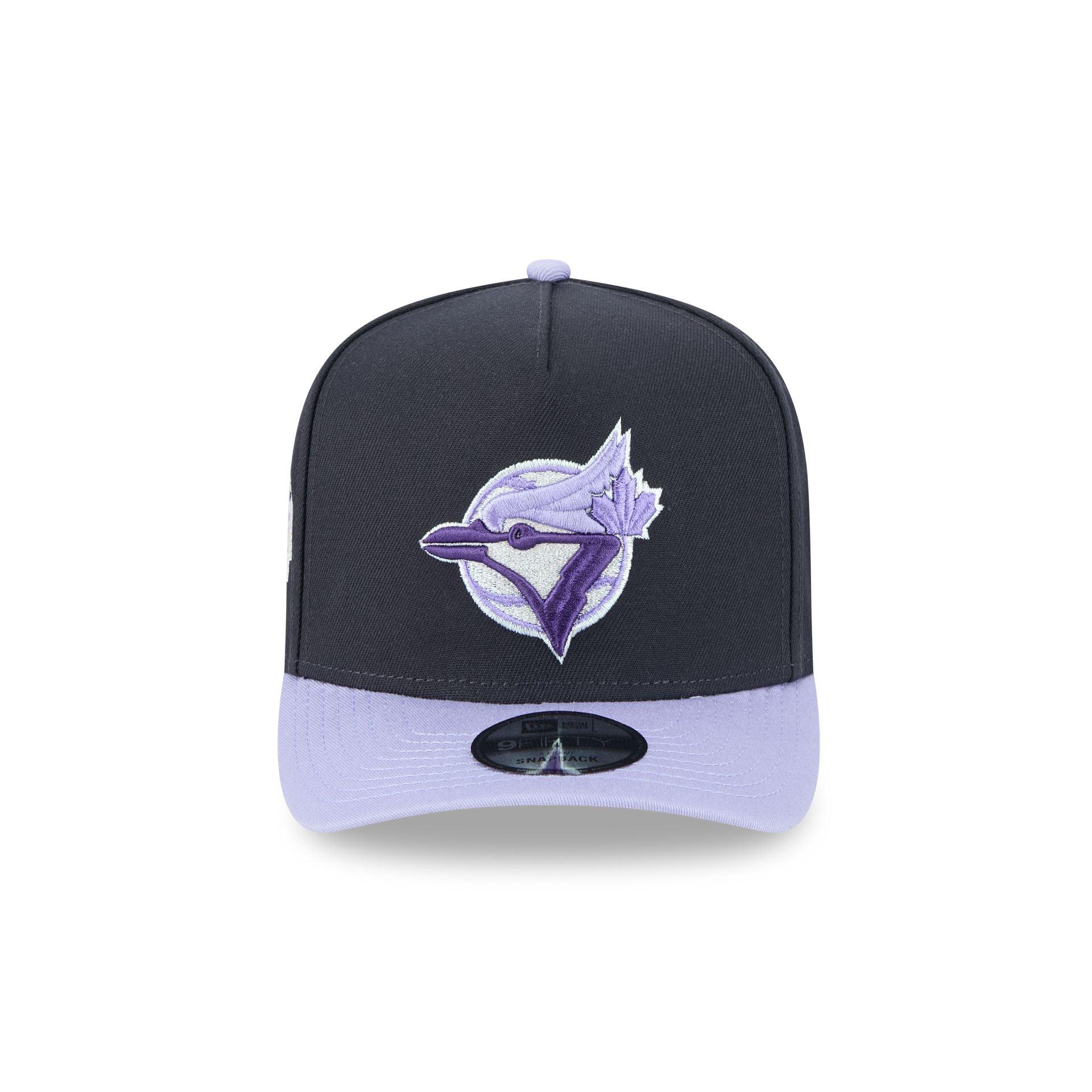 The Toronto Blue Jays Navy Lavender 9FIFTY A-Frame Snapback features an embroidered Blue Jays Cooperstown logo at the front panels with a 1991 All-Star Game patch at the right-wear side. Additional details include a snapback closure at the rear and a gray undervisor.