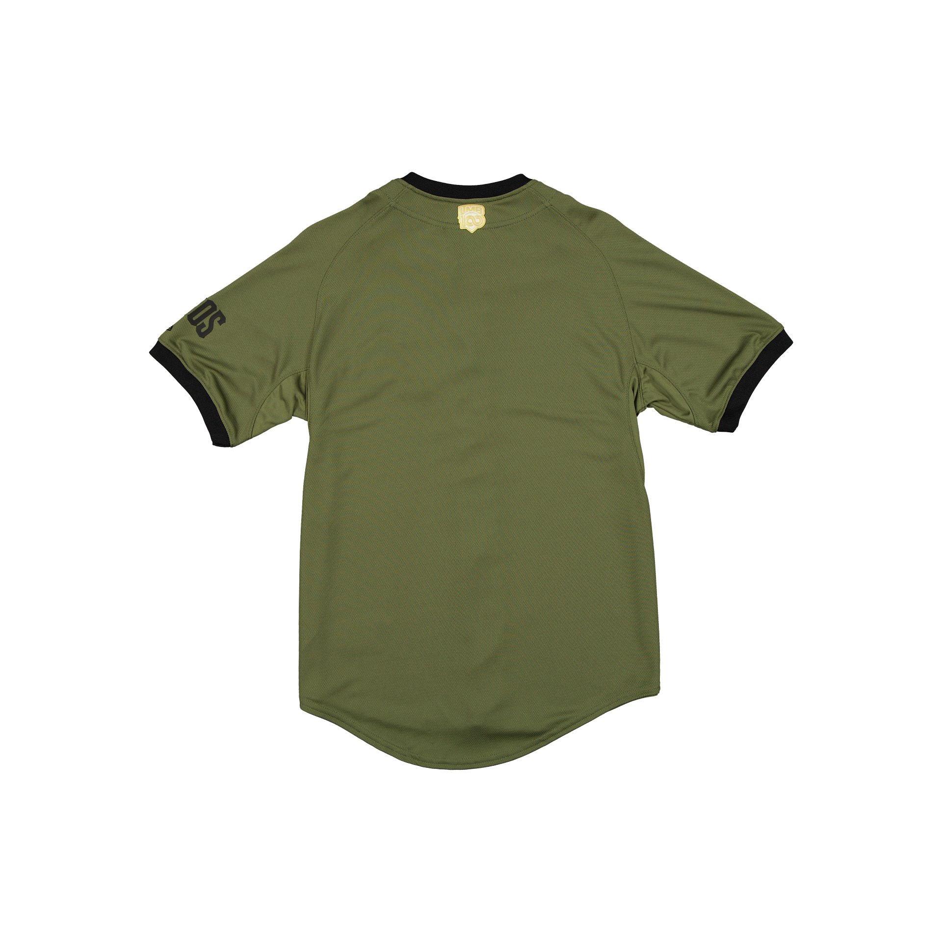 The Toros de Tijuana LMB 100th Anniversary Green Alt Jersey features an embroidered Toros logo at the left chest with a New Era Official Merchandise patch at the front hemline, a team wordmark at the left sleeve, and a LMB 100th Anniversary logo at the rear. Fabric: 100% Polyester