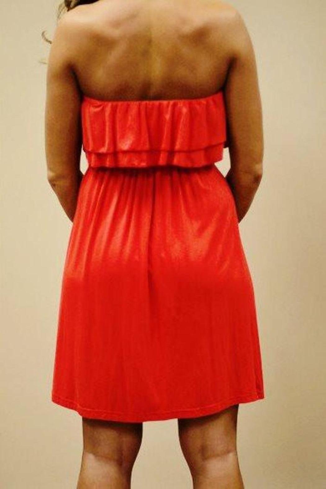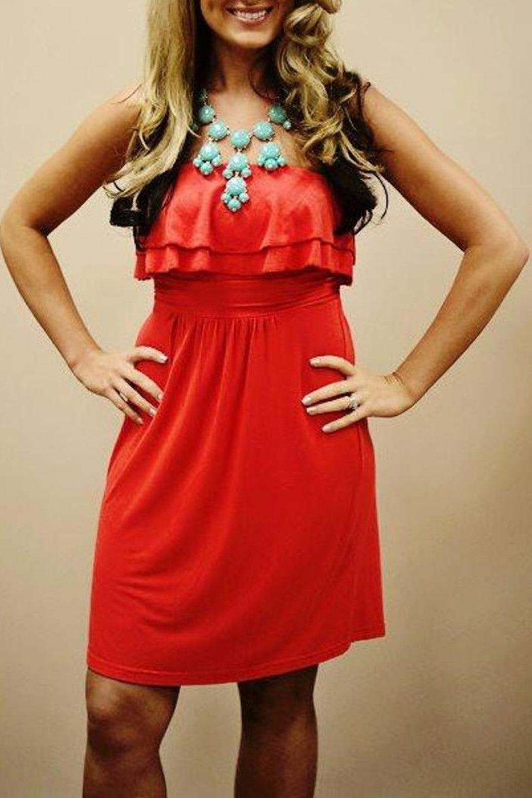 Our "Katie Dress" is a lovely poppy color, featuring a double ruffle. It looks great with cowboy boots! Anna Kate is 5'7" and is modeling a small. 95% Viscose 5% Lycra Large: Bust to Hemline 28 inches
